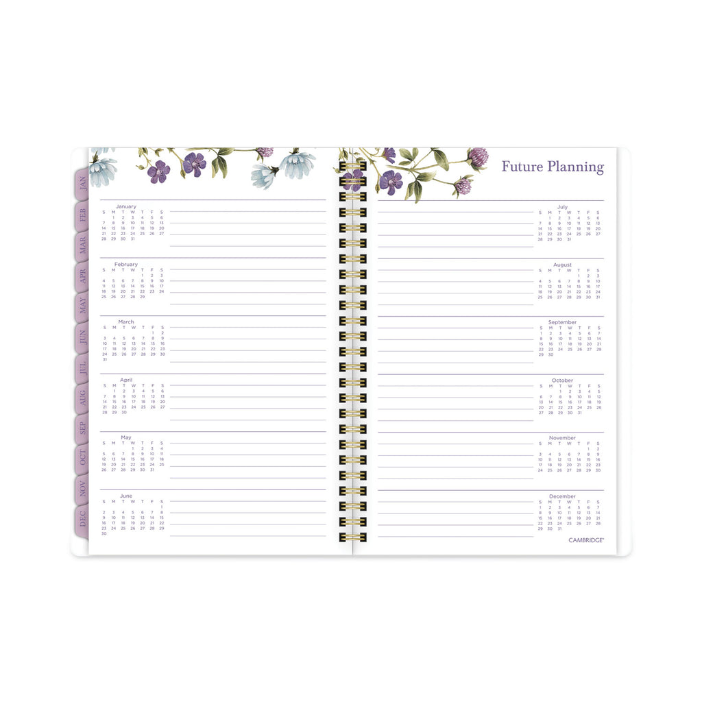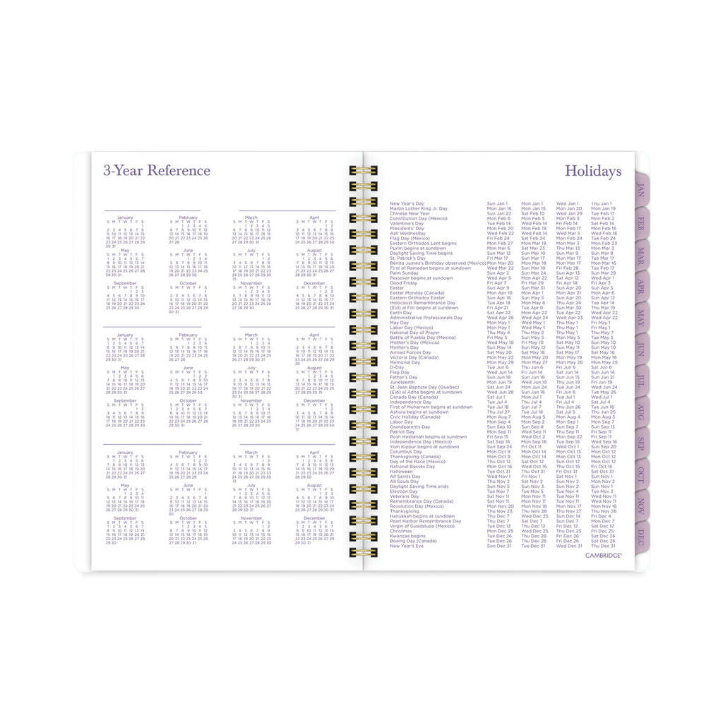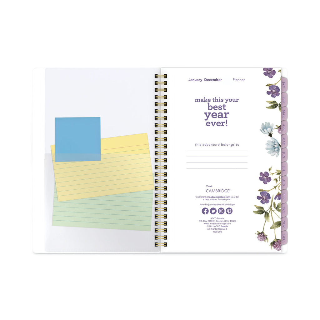 Stay on top of all of your plans this year with the Cambridge Summer Garden Weekly/Monthly Planner. Delicate flowers dance on a white background. Planner covers 12 months from January to December. One week per two-page spread has ruled planning space and a section for notes and reminders. One month per two-page spread has ruled daily blocks, a notes section, past/future month calendar references and a tab for easy navigation. Special pages include a three-year reference calendar, holiday list, two future planning, five notetaking pages and a double-sided poly pocket to store loose sheets. Durable poly cover stands up to wear and tear. Gold twin-wire binding prevents snags and keeps pages secure.
