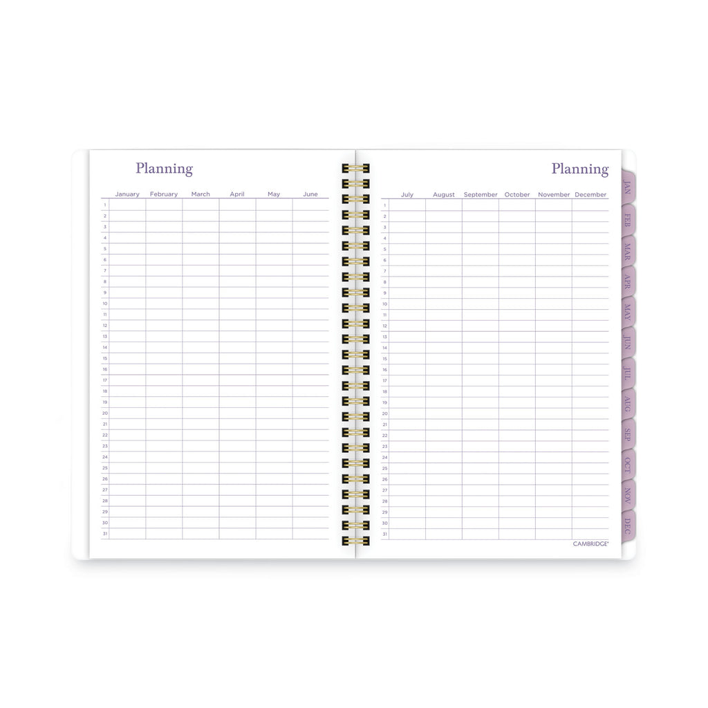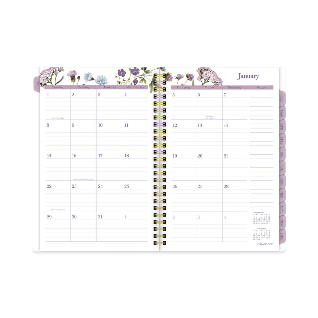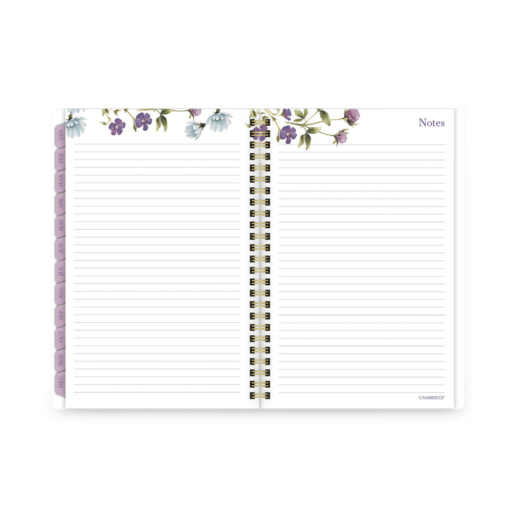 Stay on top of all of your plans this year with the Cambridge Summer Garden Weekly/Monthly Planner. Delicate flowers dance on a white background. Planner covers 12 months from January to December. One week per two-page spread has ruled planning space and a section for notes and reminders. One month per two-page spread has ruled daily blocks, a notes section, past/future month calendar references and a tab for easy navigation. Special pages include a three-year reference calendar, holiday list, two future planning, five notetaking pages and a double-sided poly pocket to store loose sheets. Durable poly cover stands up to wear and tear. Gold twin-wire binding prevents snags and keeps pages secure.
