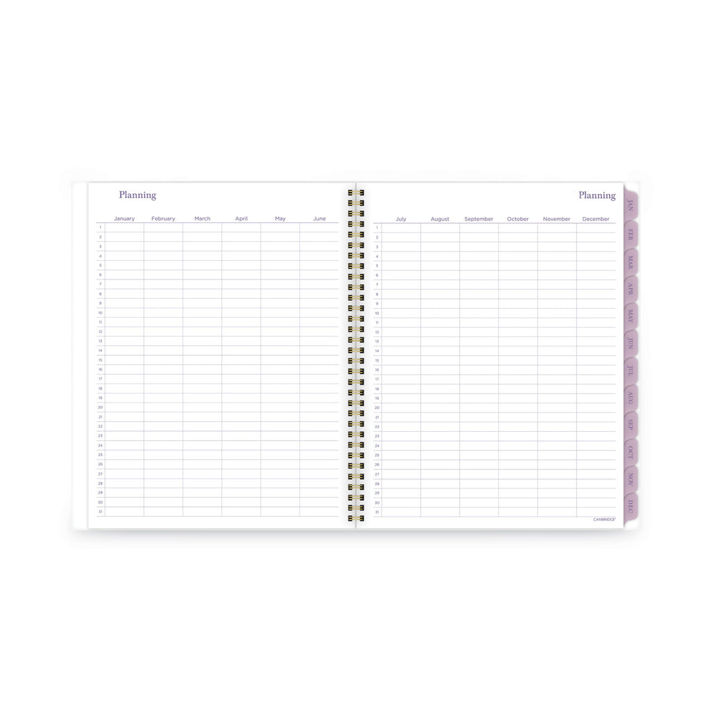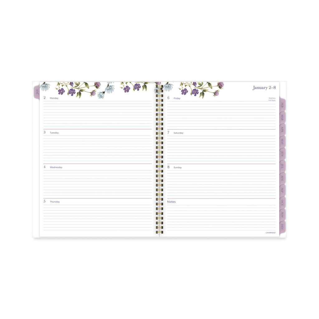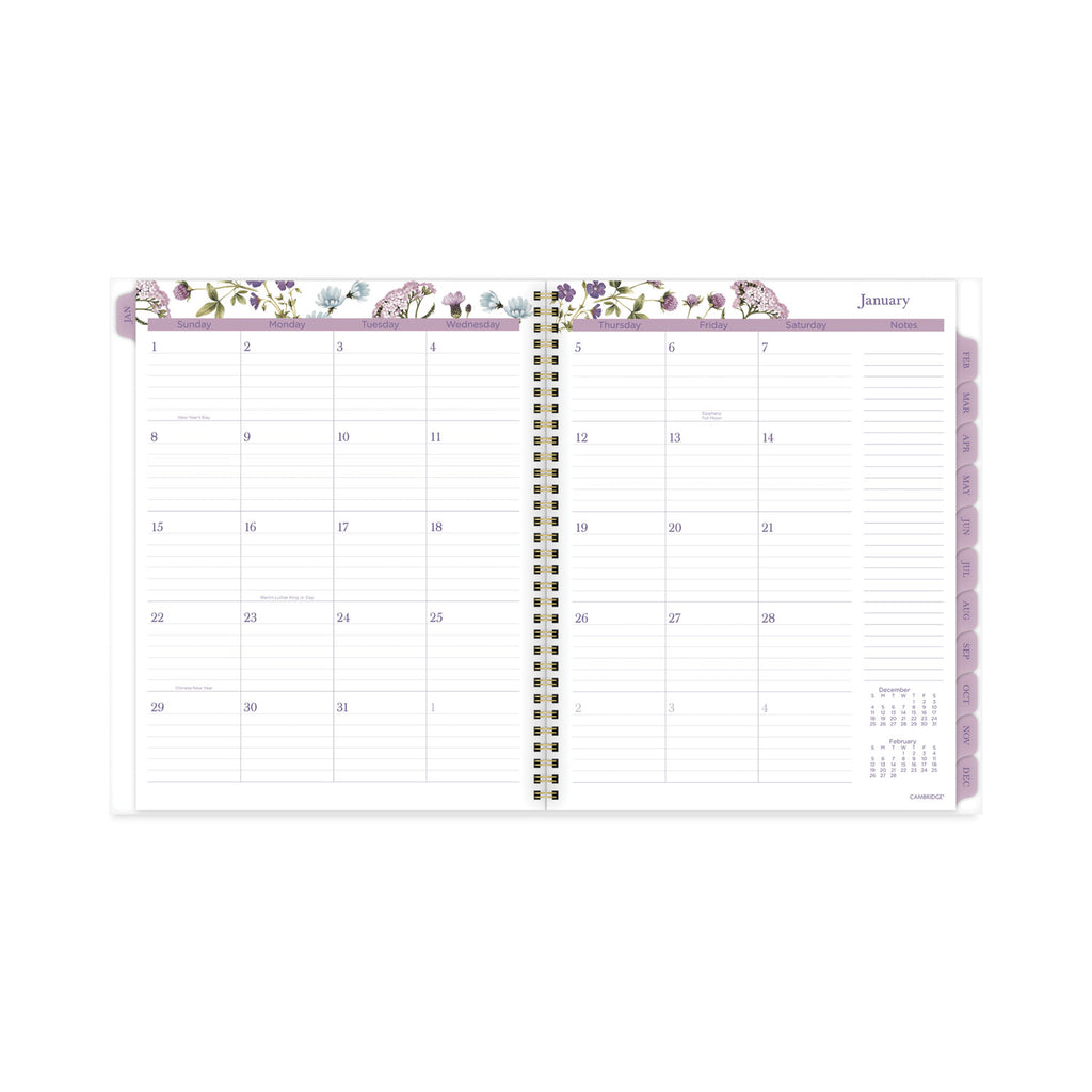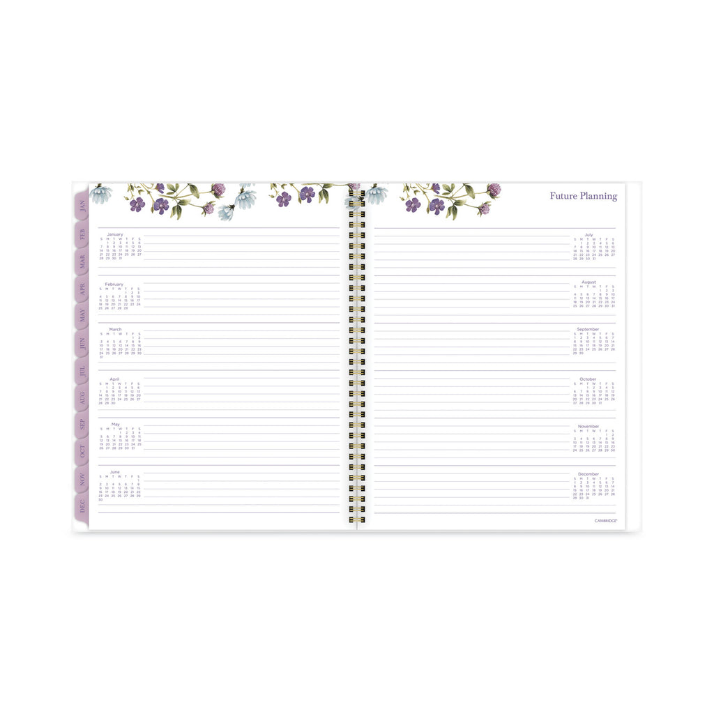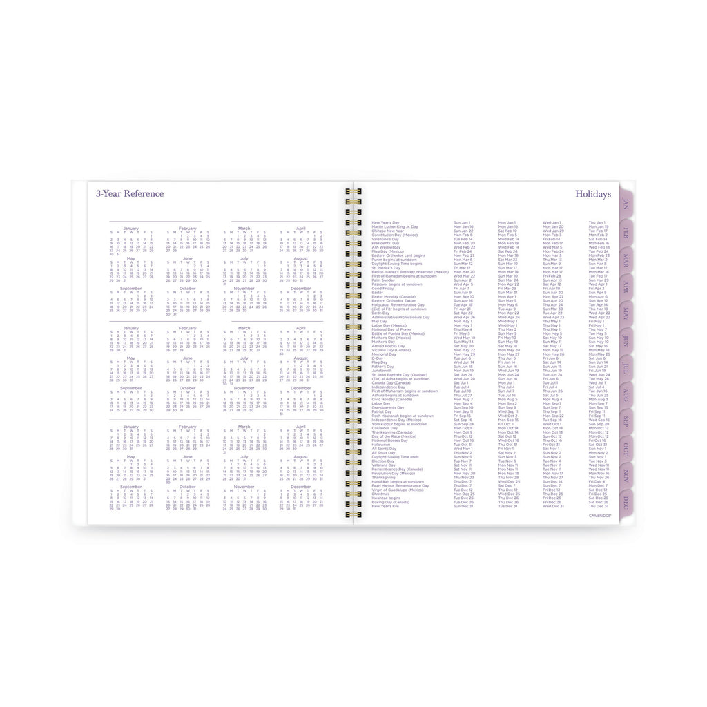 Stay on top of all of your plans this year with the Cambridge Summer Garden Weekly/Monthly Planner. Delicate flowers dance on a white background. Planner covers 12 months from January to December. One week per two-page spread has ruled planning space and a section for notes and reminders. One month per two-page spread has ruled daily blocks, a notes section, past/future month calendar references and a tab for easy navigation. Special pages include a three-year reference calendar, holiday list, two future planning, five notetaking pages and a double-sided poly pocket to store loose sheets. Durable poly cover stands up to wear and tear. Gold twin-wire binding prevents snags and keeps pages secure.