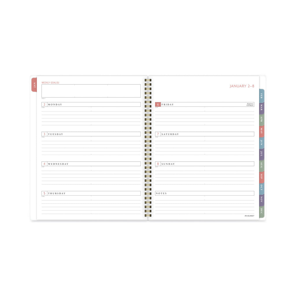 - One week per two-page spread has ruled planning space for each day, plus sections for goals and notes.