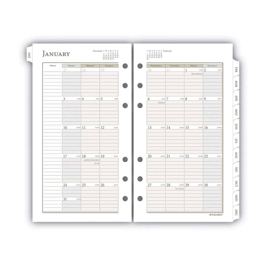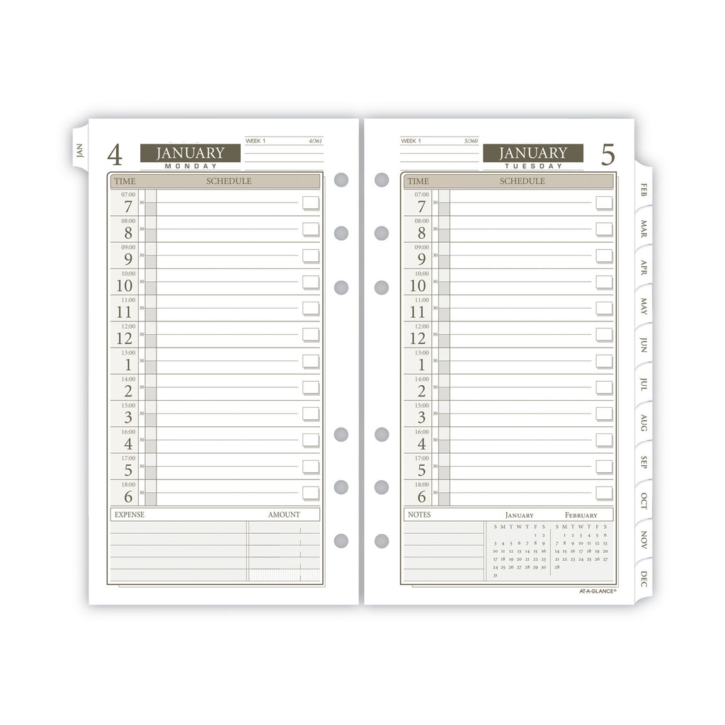 Refill covers a 12-month date range January to December. High-quality paper features superior ink bleed resistance. One day per page has appointment times with room for extra notes. Tabbed one month per two-page spread features ruled daily blocks for detailed planning and a column for notes. Pre-punched for use in a refillable organizer, sold separately.