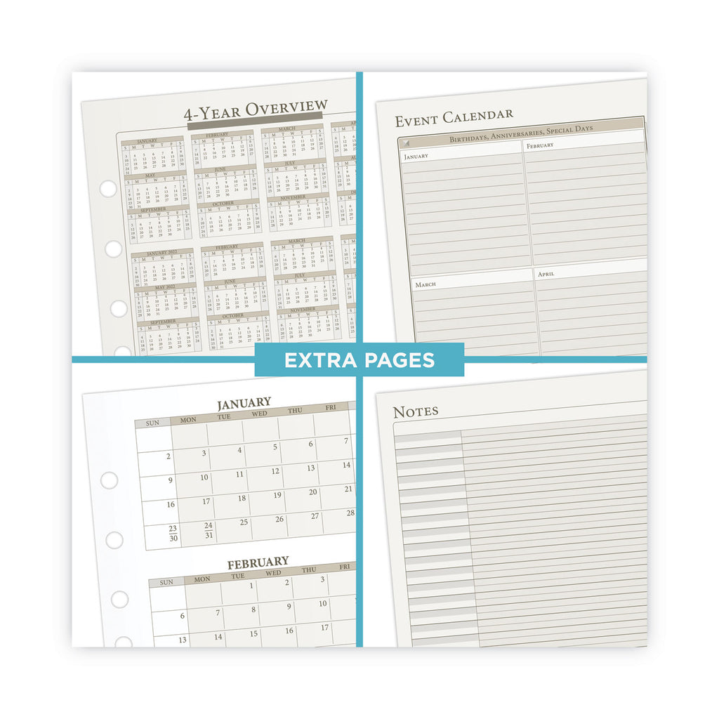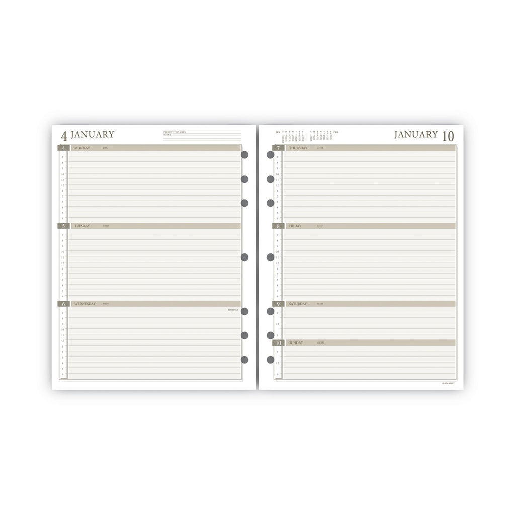 Refill covers a 12-month date range January to December with Julian dates. High-quality paper features superior ink bleed resistance. One week per two-page spread has hourly appointments from 7:00 a.m to 6:00 p.m. Monday through Friday, while weekends are condensed with 7:00 a.m., 12:00 p.m. and 6:00 p.m. ticks. Tabbed one month per two-page spread features ruled daily blocks for detailed planning and a column for notes. Pre-punched for use in a 7-ring planner, sold separately.