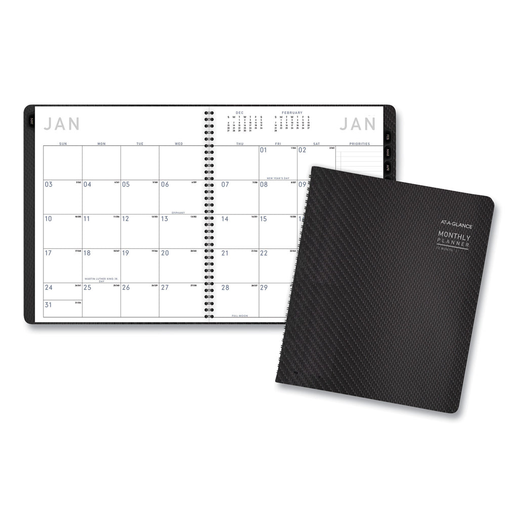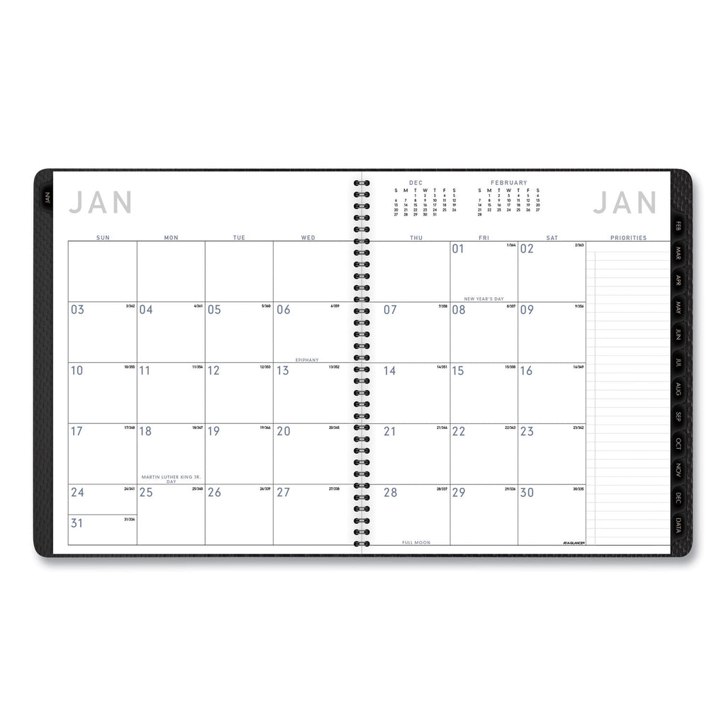 This monthly planner features a unique cover with a contemporary embossed date design for a modern-day look. Tabbed one month per two-page spread with unruled blocks. High-quality paper features superior ink bleed resistance. Past and future months reference; federal holidays highlighted. Additional pages with plenty of space for notetaking and project management included. Special information section. Twin wire binding.