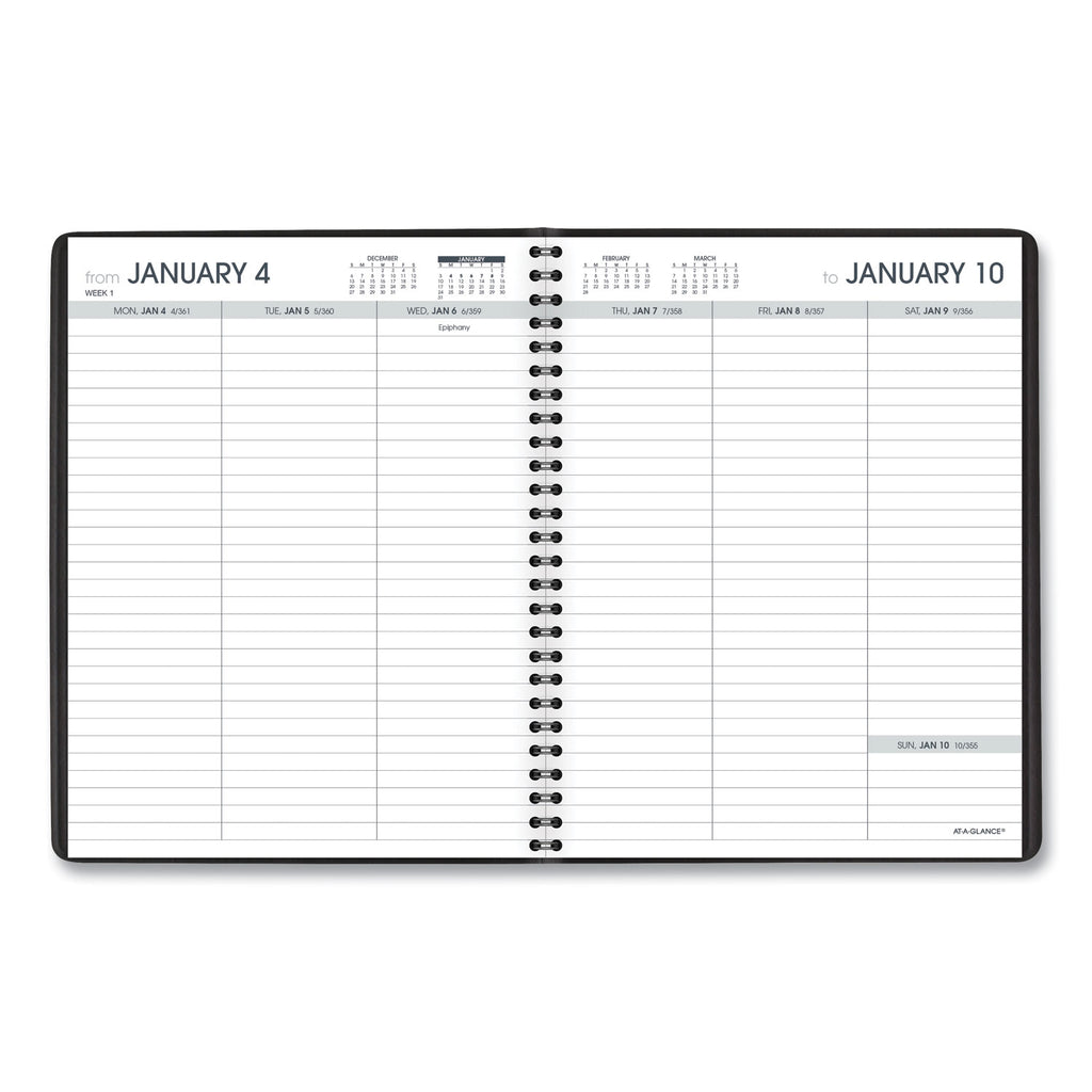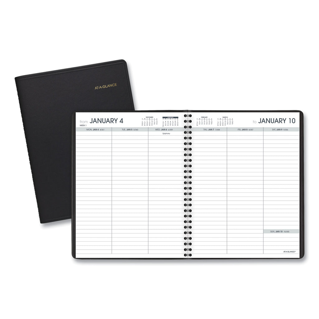 - One week per two-page spread; ruled columns for open scheduling; past, current and two future months reference.
