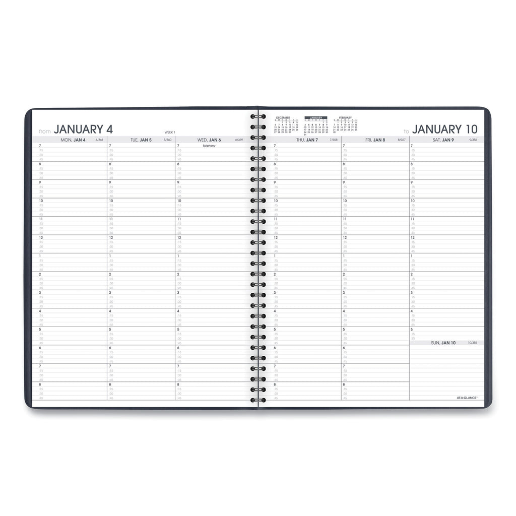 Plan your week with one column per day in 15-minute intervals. Premium paper resists ink bleed. Column-style layout for detailed planning. One week per two-page spread; past, current and two future months reference. Telephone/address pages. Premium cover for enhanced durability with a storage pocket. High-quality paper with superior ink bleed resistance. Guaranteed to last all year. ACCO Brands will replace any AT-A-GLANCE planner that is returned within one year from the date of purchase. This guarantee does not cover damage due to misuse or abuse.