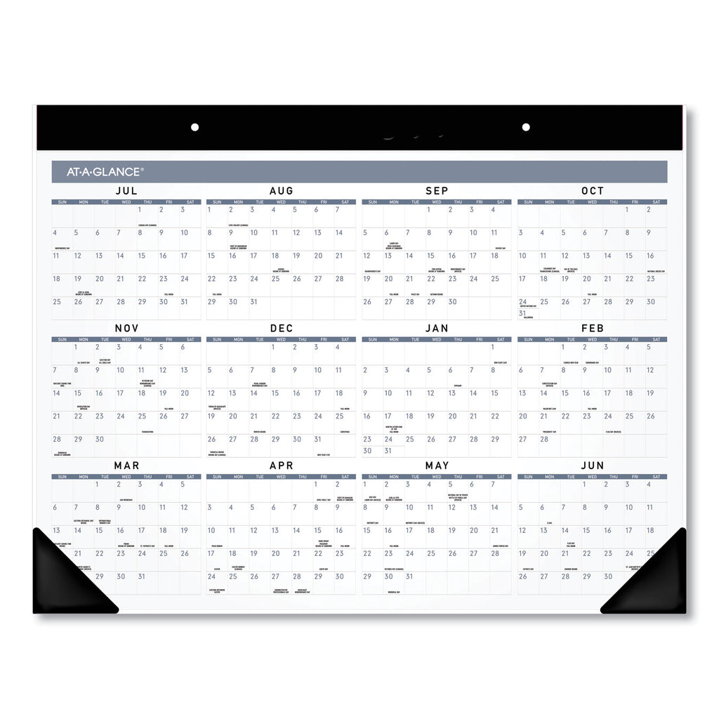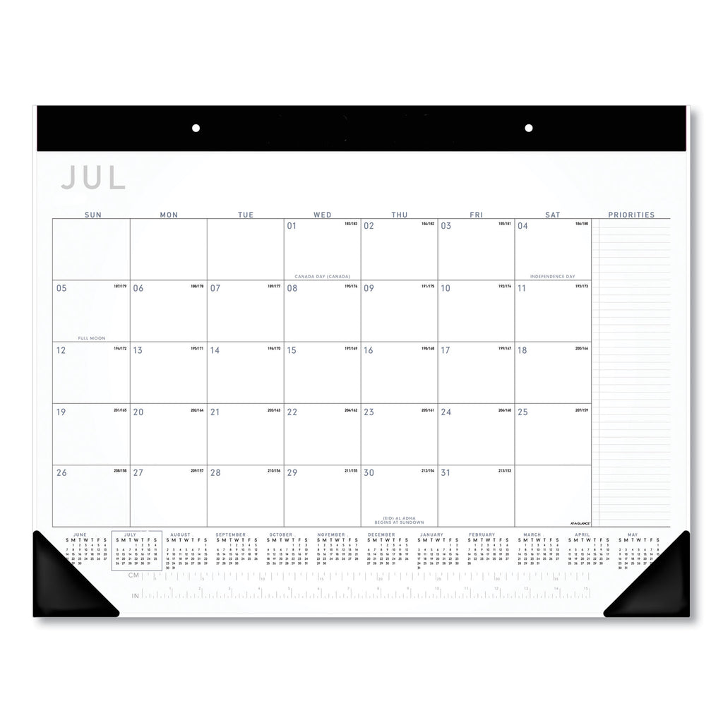 Contemporary monthly desk pad has unique top binding, modern design, and extra features for simple planning. Keep track of important dates, plus have space to record priorities and notes. Covers 12 months from July - June with Julian dates. Full year academic calendar reference (June - May) and a metric/imperial ruler runs across the bottom of each monthly page for quick measurements.