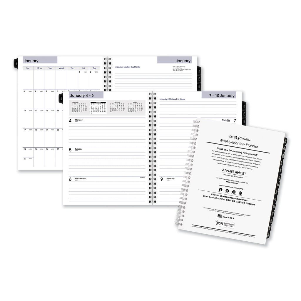 Weekly: one week per two-page spread; ruled block-style for open scheduling; past, current and two future months reference. Monthly: tabbed, full months with unruled blocks on left page, notes space on right. Separate telephone/address and special 16-page information sections. Printed on high-quality with superior ink bleed resistance.