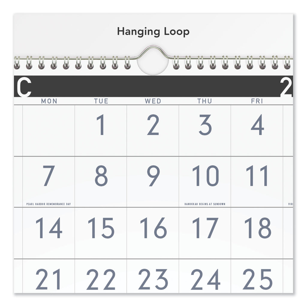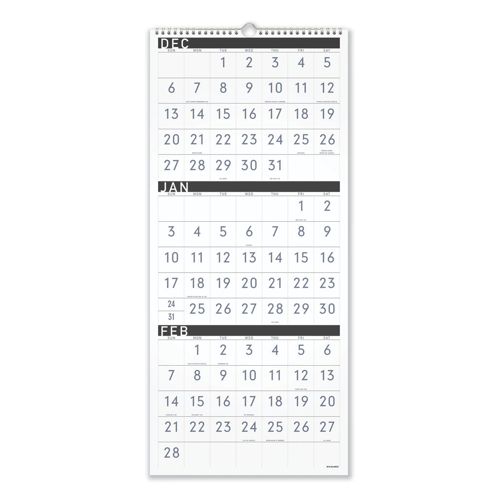 Calendar with contemporary design provides a convenient three-month page view. Date range covers 14 months in total from December - February. Three months per page are laid out vertically: past, current and future month. Large, easy to read numbers make this calendar especially great for reference. Full chipboard backing provides durability. High-quality paper features superior ink bleed resistance. Calendar is wirebound with stylish wire. Built-in loop allows for easy wall hanging.