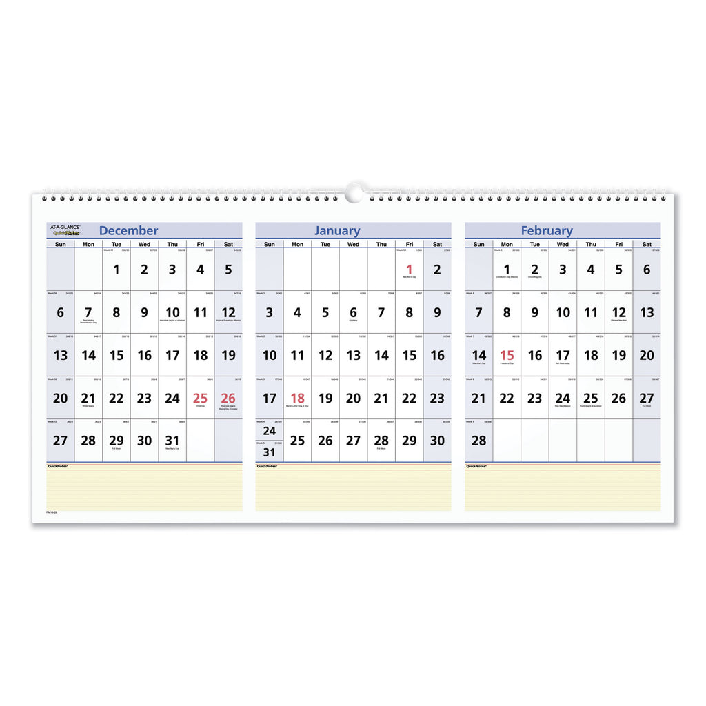 Yellow highlighted section for notes and to-do's. Horizontal orientation is perfect for cubicle-sized walls. One month per page with ruled blocks; shaded weekends. Past and future months reference. Federal holidays printed in red. Wirebound with hanging loop. High-quality paper with superior ink bleed resistance.