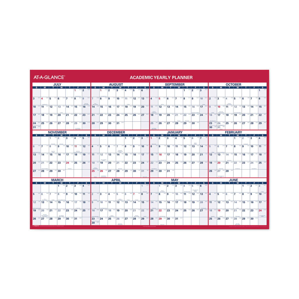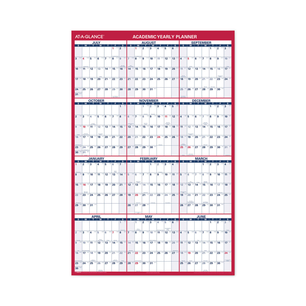 Schedule your way with a wall calendar that fits your space. The reversible calendar displays 12 months in a vertical yearly layout on one side and a horizontal layout on the other. Write-on/wipe-off surface makes for quick and easy update. The AT-A-GLANCE Academic Vertical/Horizontal Erasable Wall Calendar is the perfect tool for plans that are constantly changing. Calendar covers a 12 month date range from July-June with Julian dates for academic planning. Choose the orientation which best fits your space. Blocks measure 1.69" x 1.63" on one side and 1.44" x 2" on the other for plenty of space to write in your schedule and notes. Bold, large print and bright white background makes notes easier to see and read. Wet-erase marker included.