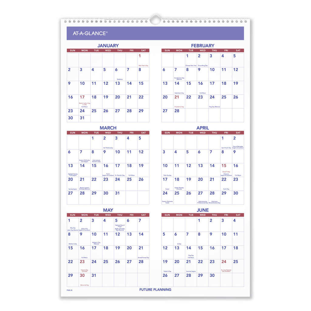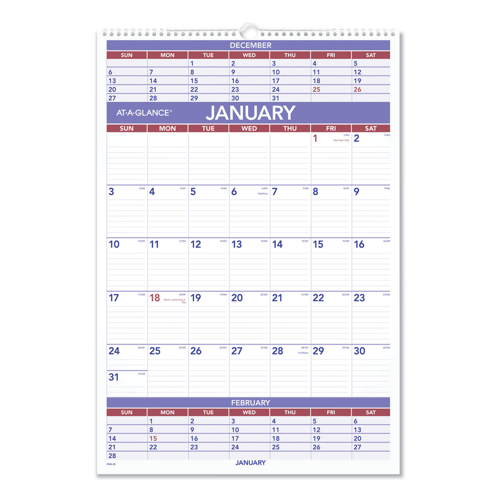 Three-month view with plenty of space for planning in the current month. Three months per page: large current month with ruled blocks, condensed past and future months. Federal holidays highlighted. Bonus page: six future months. Chipboard backing; white wirebound with hanging loop. Contemporary design with plenty of writing space. Printed on high-quality paper with superior ink bleed resistance.