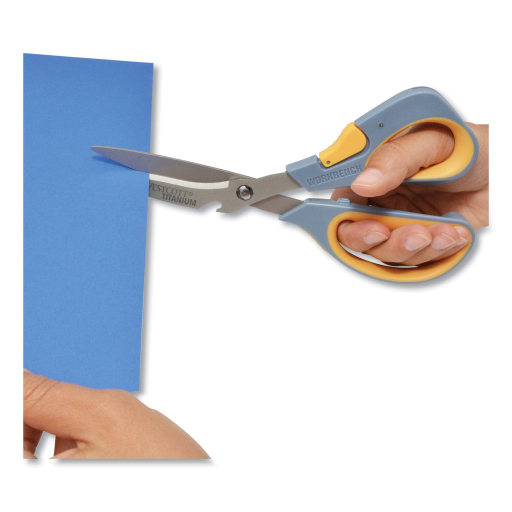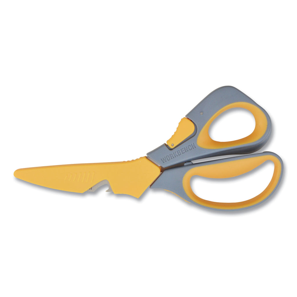 High-performance serrated titanium provides three time the strength of stainless steel and stay sharper longer. Serrated blades grabs and easily cuts heavy material. Integrated ceramic utility cutter to safely open boxes and bottle opener. Oversize contoured soft grip handles for comfort and control while in use. Detachable serrated blades are easy to clean. Ideal for opening plastic packages, cardboard, strapping, thick fabric and more. Includes protective sheath to keep blades safe.