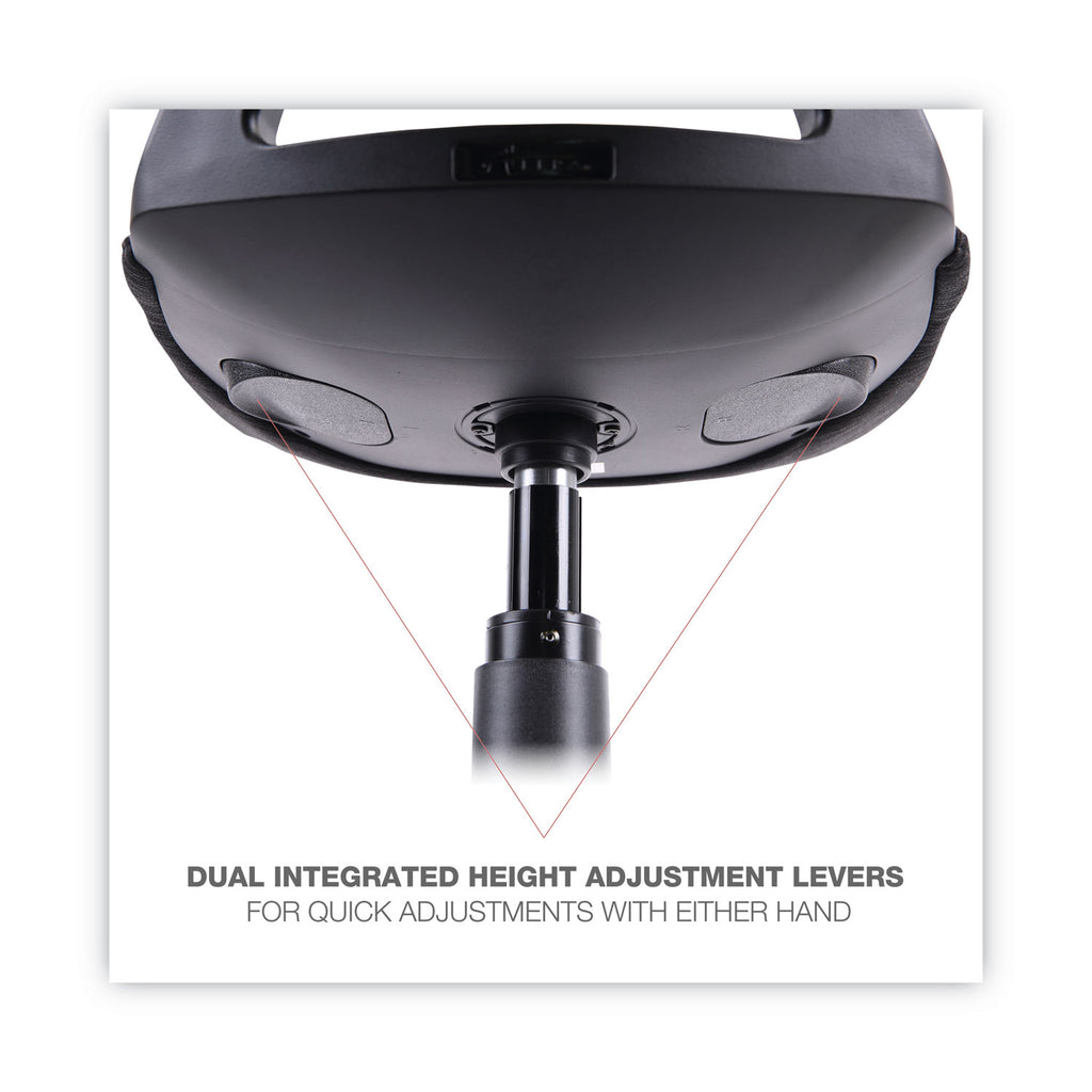 Advanced active ergonomics goes from sitting to standing with ease. Pivoting angled column moves with the body for constant alignment. Perch or lean when you wish to perform fast tasks or fully sit down when you wish to concentrate on more complicated tasks. Goes from sitting height to standing height. Perfect for use with height adjustable workstations. Auto return swivel seat moves with the body as you twist, and returns to front automatically when you get up. Dual integrated height adjustment levers for quick adjustments with either hand. Wide boomerang base for stability when leaning far forward.