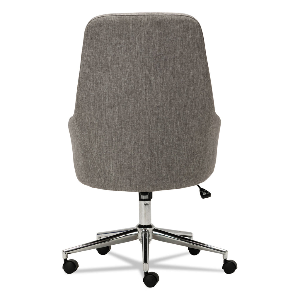 A modern captain's chair with a commanding style. Make a statement at your desk or in the conference room. Cushioned seat and back with durable fabric upholstery. Contoured rounded back and arms for the perfect support. Integrated bolstered headrest. Extended seat edge to help reduce pressure points at the back of the knee. Tilt tension and lock for control when reclining. Chrome five-star base for style and mobility.