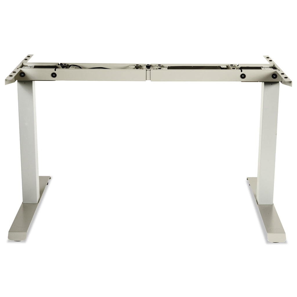 Set the perfect height when sitting or standing, when you choose this electric, two-stage, height-adjustable table base. Durable, powder-coated steel base features a 250 lb maximum lift capacity (maximum capacity includes the sold-separately table-top), a 19" lift/lower range (from 27" to 47") as well as a standard up-and-down control set. Dual-motors provide speeds of up 0.8" per second (depending on overall load); and though designed specifically for use with ALETT Series Reversible Laminate Rectangular Table Tops (sold separately), these steel-frame bases attach to most common rectangular tops ranging from 48" to 72" in width and 24" to 36" in depth. Integrated crossbar supports prevent racking while ensuring overall stability. Adjustable leveling glides help you compensate for uneven floors. Base includes integrated cable-management channels and a 9.8 ft power cord. Quick setup with fold-out legs—requires minimal assembly. Table tops and bases are sold and shipped separately—ORDER BOTH.