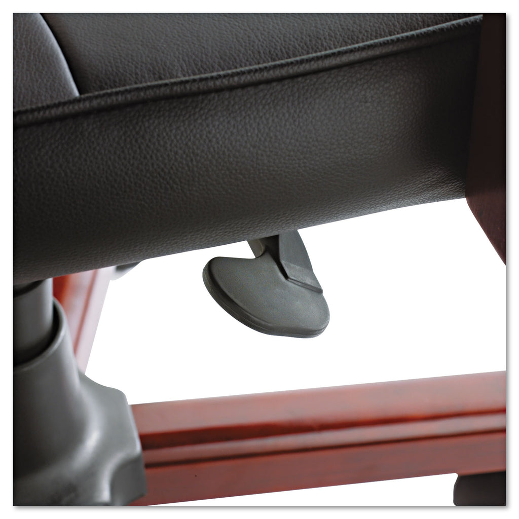 Mid-range knee tilt and a high-back combine for relaxed comfort. Soft-touch bonded leather upholstery and padded armrests. Mahogany finish trim for a touch of warmth.