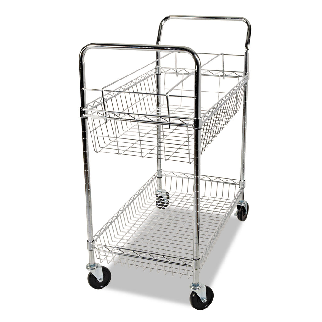 Ideal mobile carry-all cart. Use to haul mail, packages, boxes, books or files around the office. Top basket can accommodate letter- or legal-size files with included adjustable file rods. 7" deep top basket. Sturdy bottom basket with 4" raised sides to prevent larger items from sliding off during transport. Heavy-duty metal tube and wire construction resists scratches and withstands constant use. Commercial grade 4" casters with two locking. Snaps together in minutes without tools. Shelf and basket height adjustable in 1" increments.