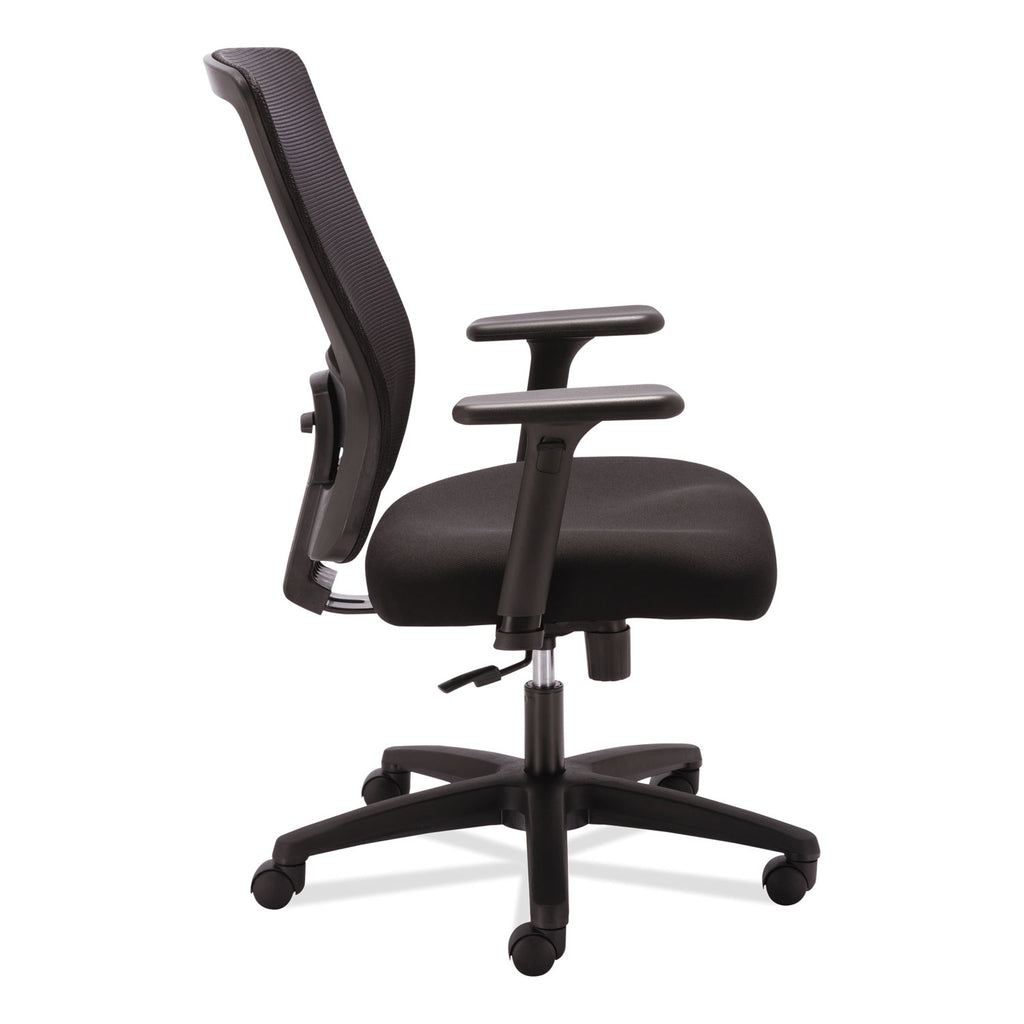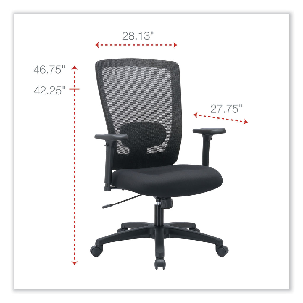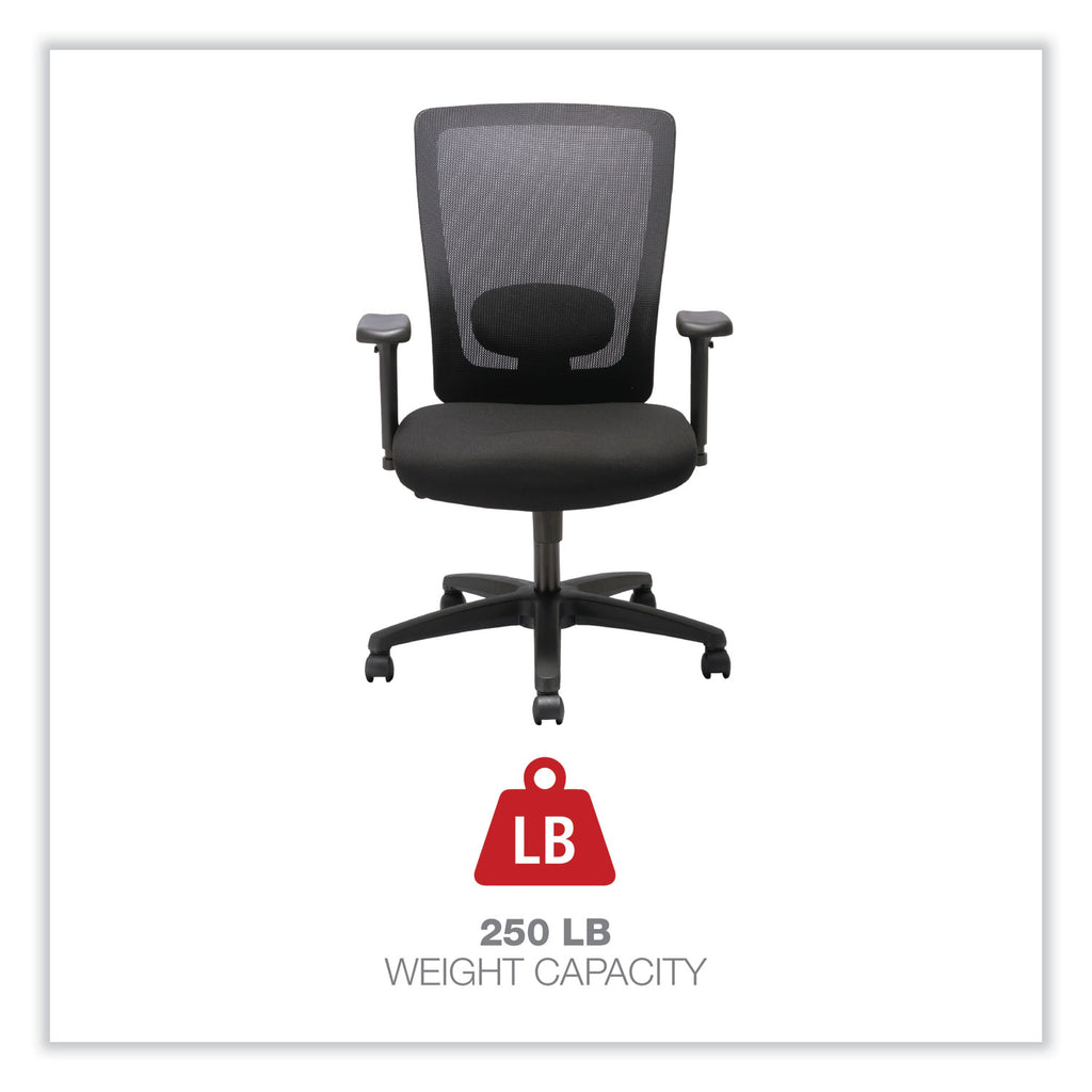 This high-back chair with breathable mesh back has swivel-tilt with lock and tension control which allows users to adjust to the demands of the workday. Controls are easy to reach and simple to understand. Lumbar support can be adjusted to fit a variety of users. Built-in tilt tension controls the rate and ease of recline while tilt lock secures the chair in the full upright position. Height and width-adjustable arms provide added comfort. 360-degree swivel provides ease of movement in any direction. Supports up to 250 lbs.