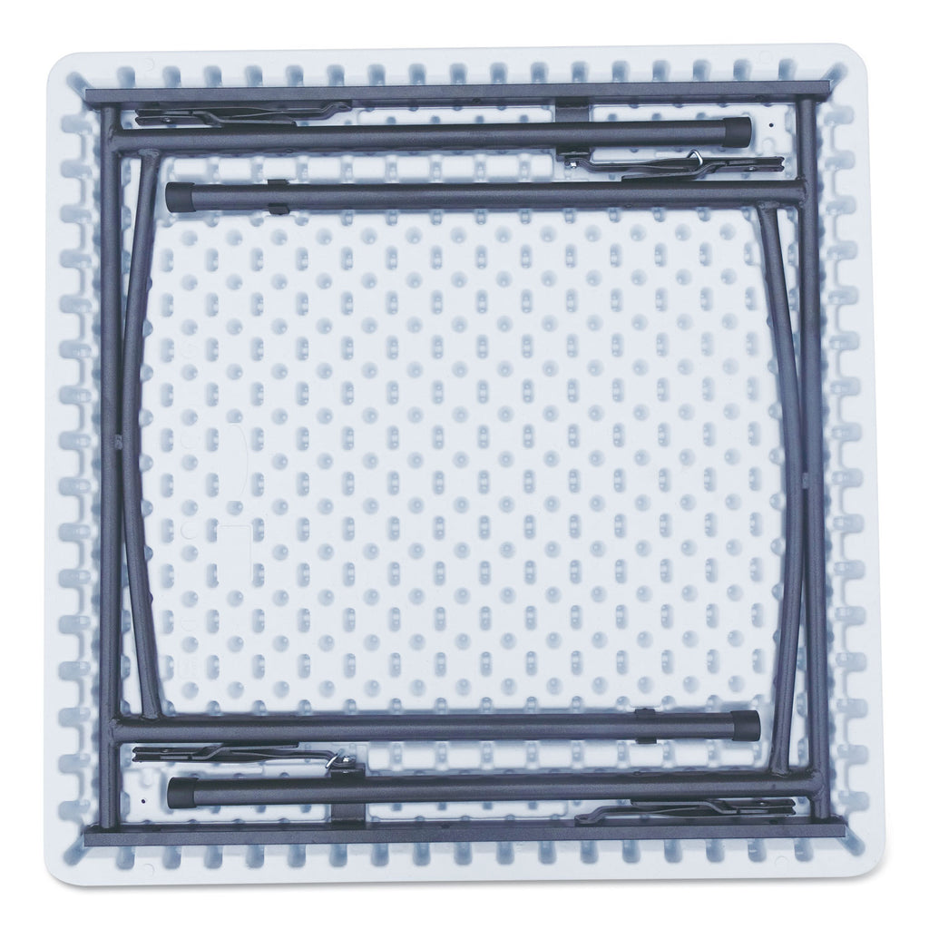 Versatile folding table is perfect for indoors or outdoors. Convenient square, folding table sets up quickly when you need an extra table and space is limited. Blow-molded polyethylene top is water and stain resistant to ensure it won't crack or stain. Strong, durable, powder-coated metal construction withstands dents and scratches. Slide lock feature enhances table stability once opened. Legs fold flush into table creating a flat surface for easy storage and stacking. Non-marring foot caps prevent floor damage. Supports up to 600 lbs of evenly distributed weight.