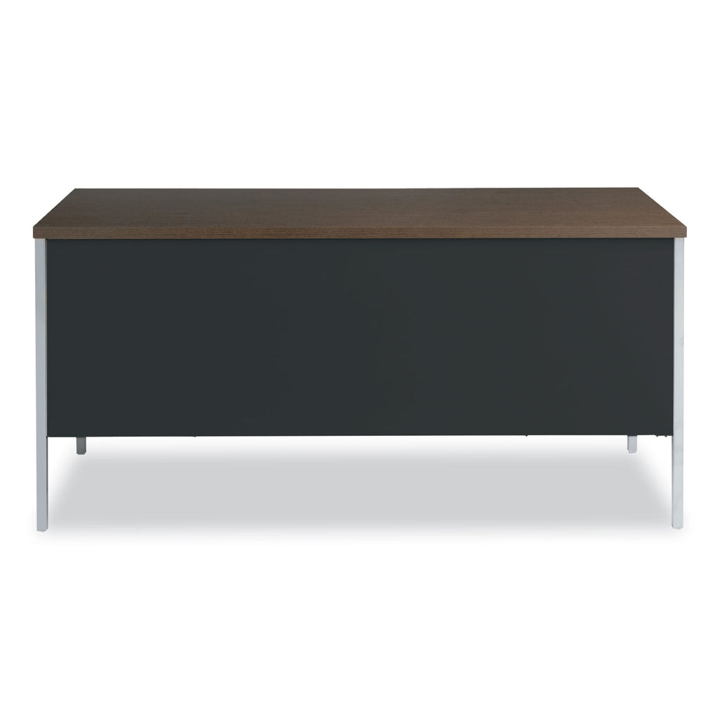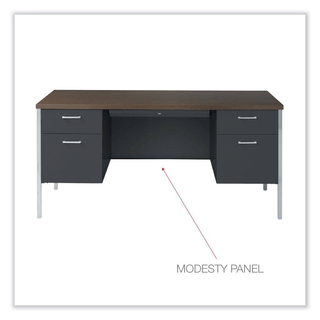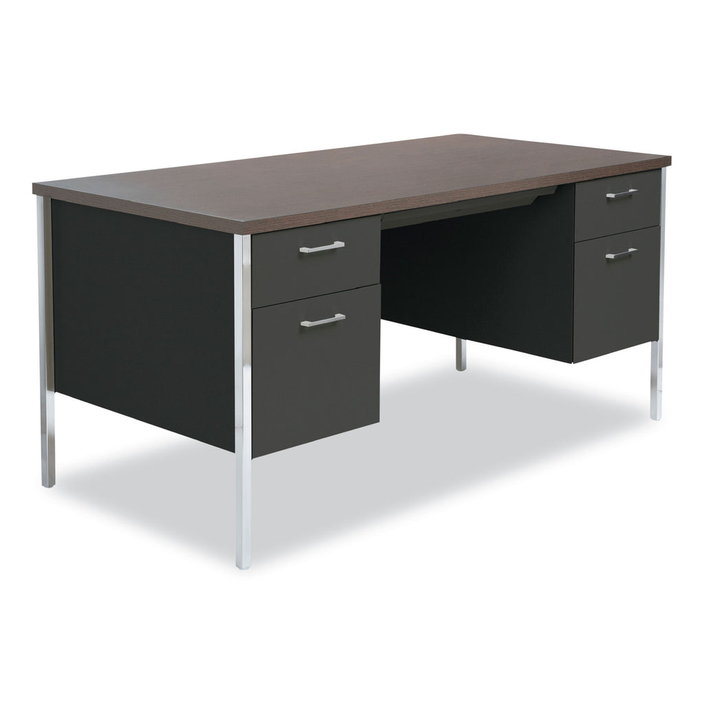 Solid and stable desk with square edge, laminated top that is scratch and stain resistant. Built with a durable, powder-coated steel frame with chrome-plated, 1" square, tubular steel legs. Includes a full extension, locking file drawer with telescoping ball bearing slides to accommodate hanging file folders. Box drawer operates on steel roller suspensions. Center drawer lock secures all drawers. Aluminum drawer handles. Three-quarter height modesty panel provides privacy. Leveling glides adjust for uneven floors.