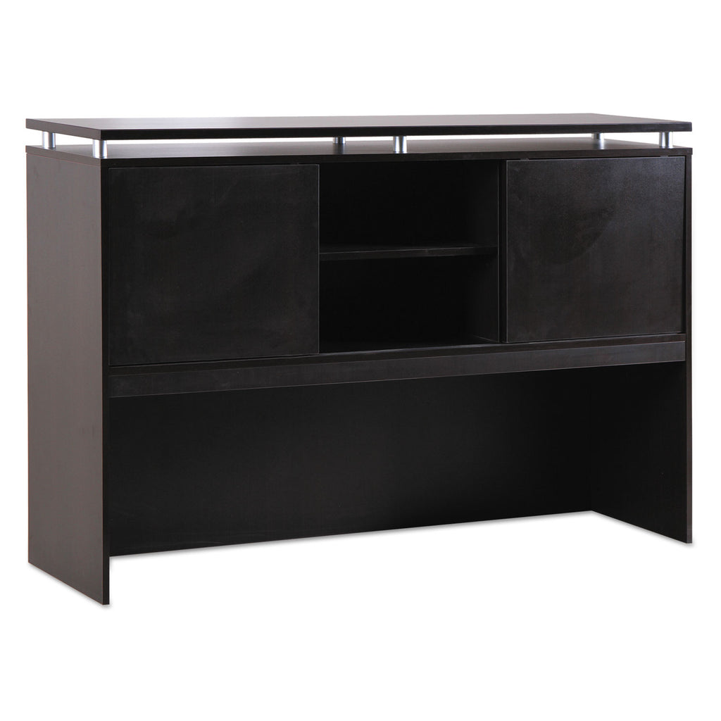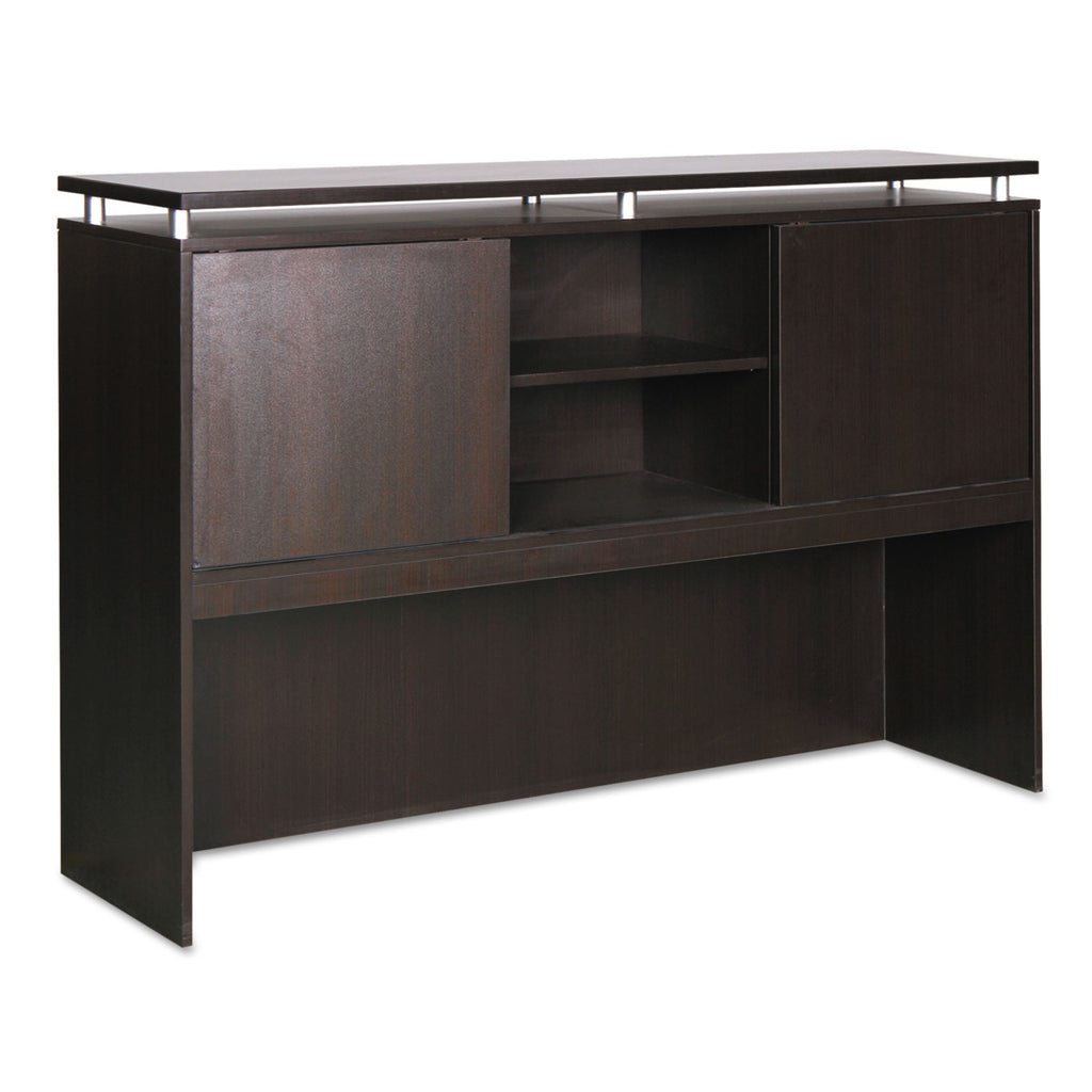 A contemporary classic with clean lines, elevated top and modern silver metalwork. Thermally fused woodgrain laminate is scratch-, dent- and water-resistant. Compartmentalized storage with adjustable shelves and two sliding doors. 20 1/2" clearance accommodates most monitors for space efficiency. Light valance and four grommets for easy cable management or task light installation. Optional tackboard helps keep you organized.