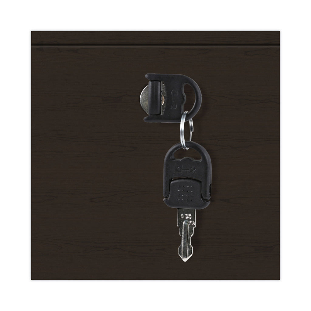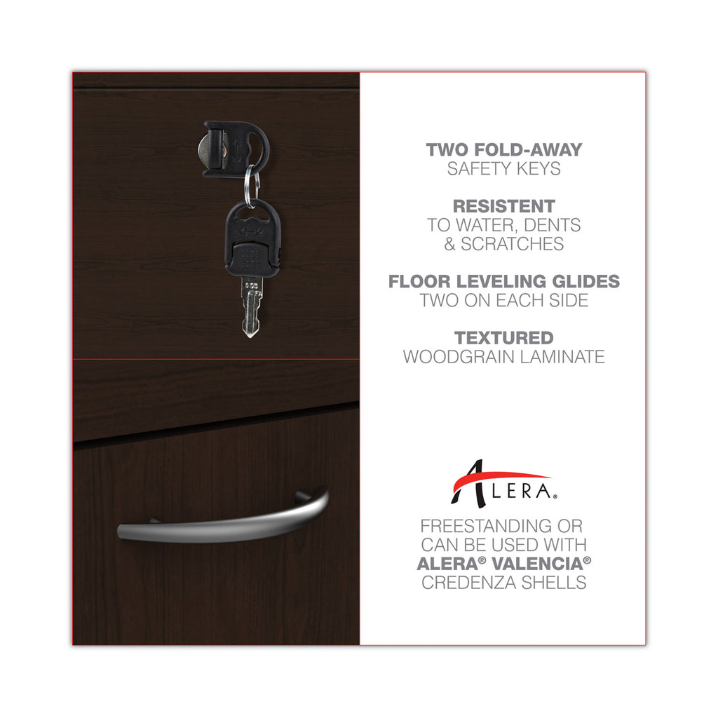 Sturdy, four-sided drawer construction file cabinet with separate front panel. Durable construction that’s designed to resist water, scratches, and dents. Finish has a charcoal accent line under worksurface. Can be used as a freestanding file or in combination with credenza shell, which is sold separately. The top removes for installing under worksurface. Two, fold-away safety keys (included) for a slimmer profile.