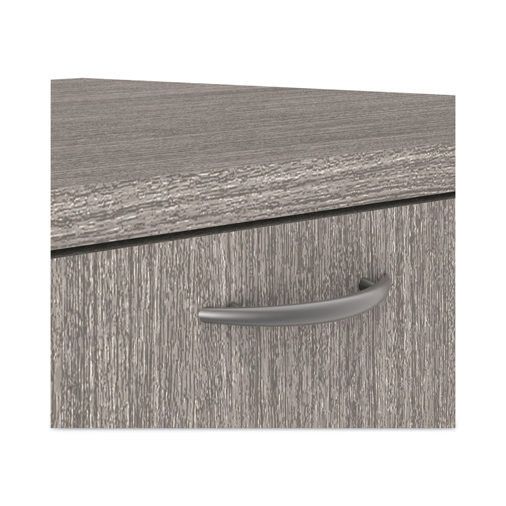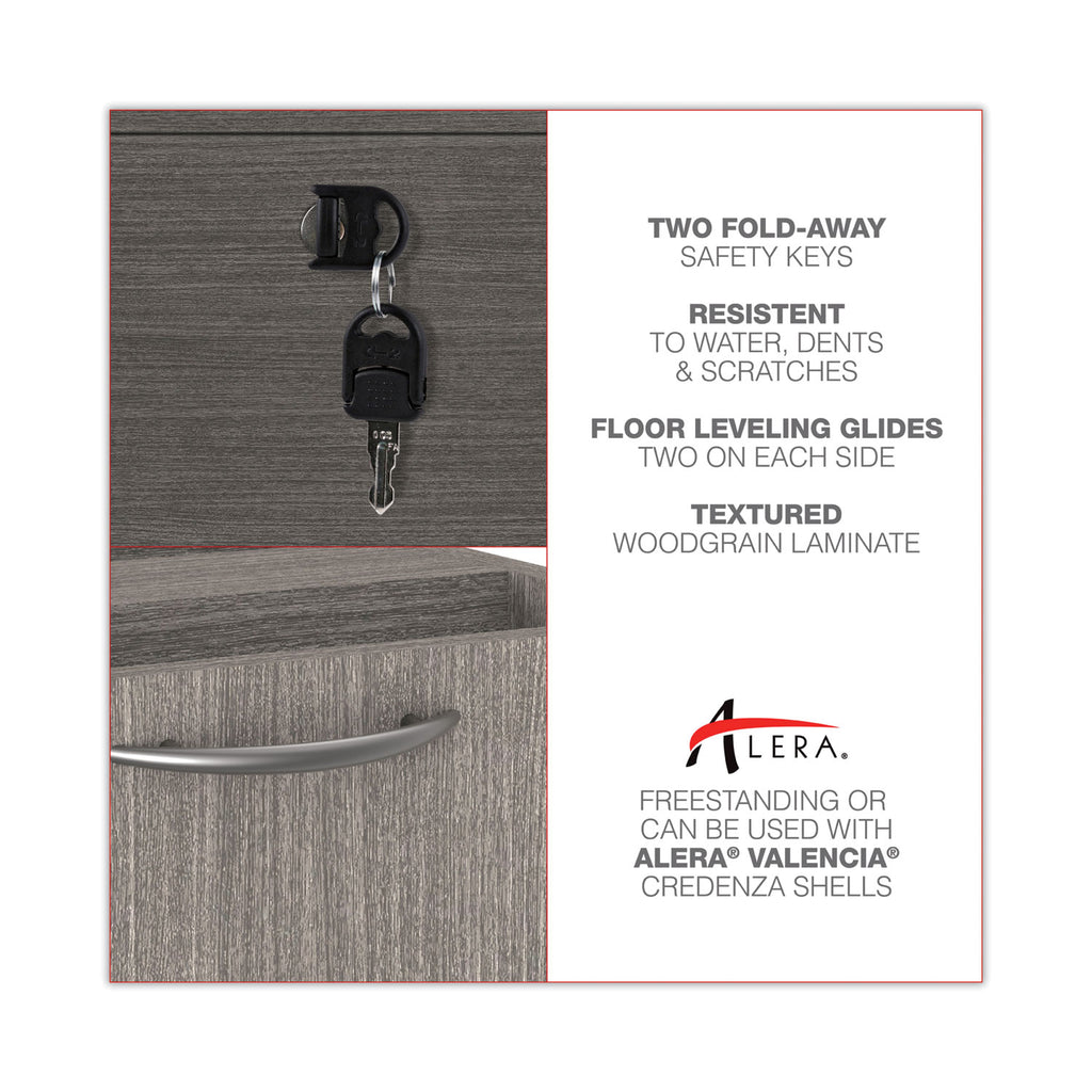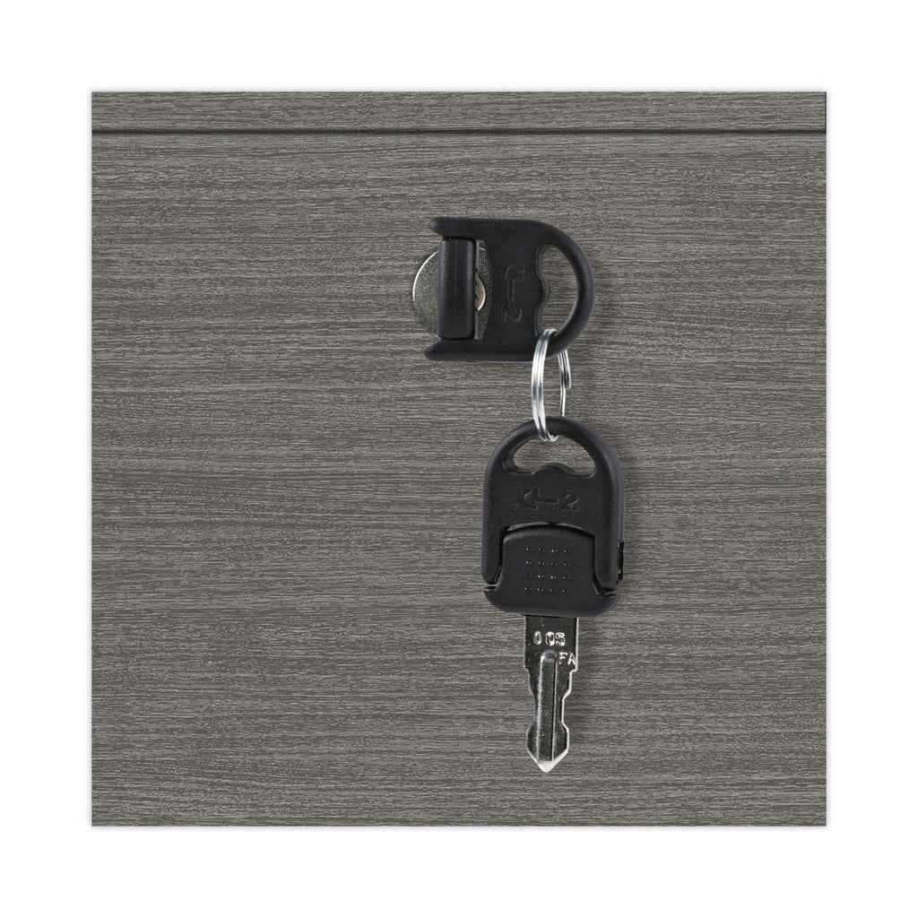 Sturdy, four-sided drawer construction file cabinet with separate front panel. Durable construction that’s designed to resist water, scratches, and dents. Finish has a charcoal accent line under worksurface. Can be used as a freestanding file or in combination with credenza shell, which is sold separately. The top removes for installing under worksurface. Two, fold-away safety keys (included) for a slimmer profile.