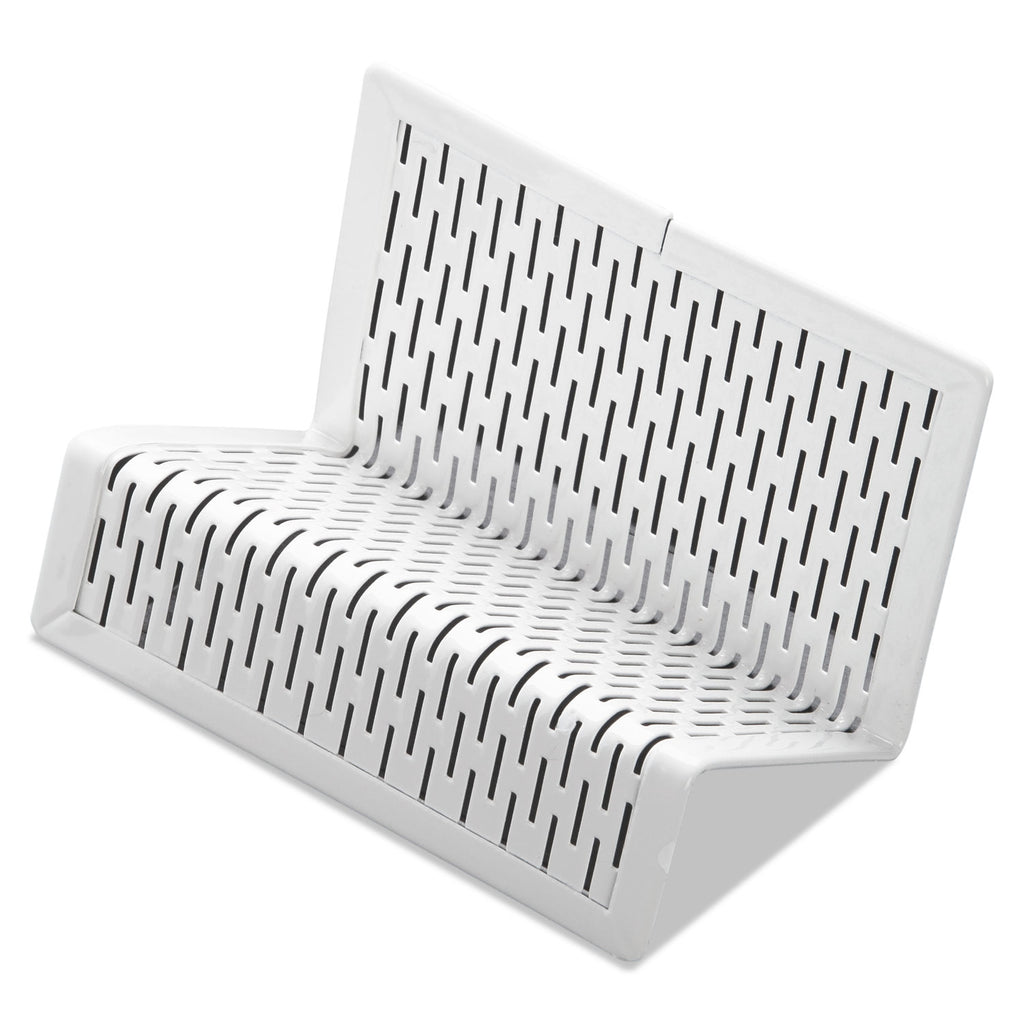 Strong, professional grade punched metal with decorative urban style slotted pattern. High quality satin finish complements any décor. Features protective feet to prevent surface wear and scratches on the desktop surface. Reinforced rounded edges provide durability and attractive detailing. Holds and stores up to 50 business cards for a professional presentation to your clients and customers.
