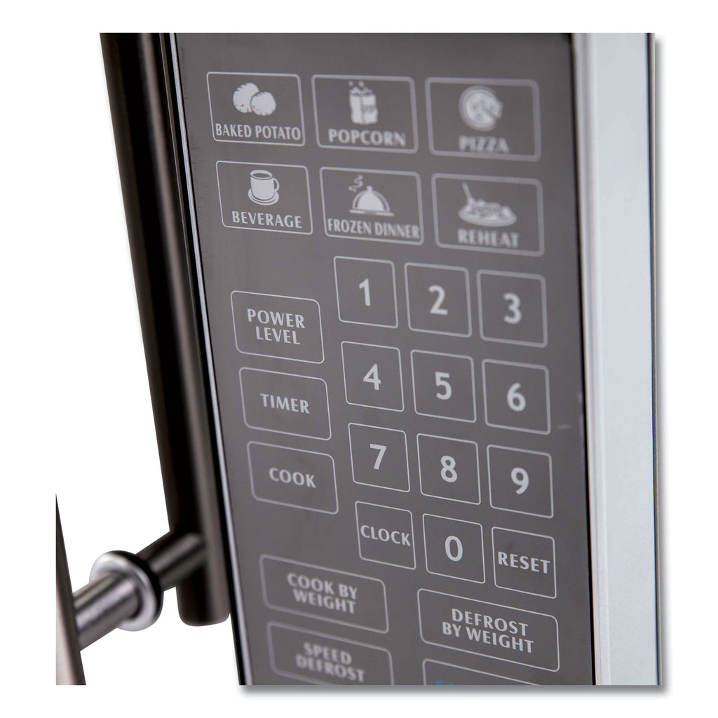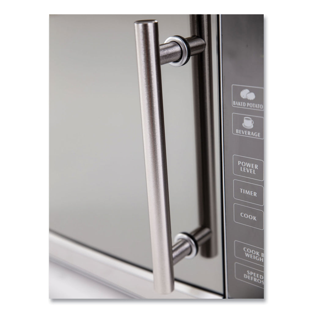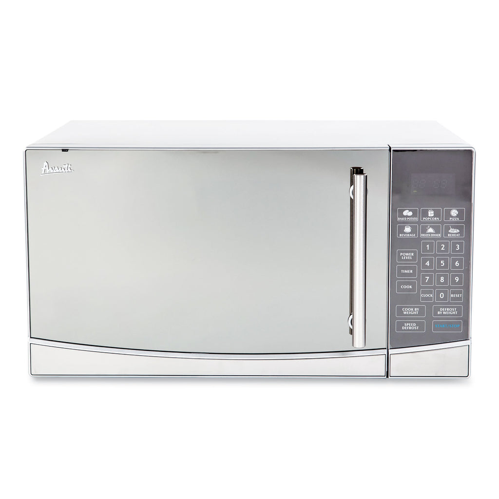 Save counter space with this compact, 1.1 cubic foot, stainless steel microwave oven with mirrored door from Avanti. The perfect countertop microwave for the dorm, man cave, office, studio apartment, RV, tiny home, rental room, condo, vacation home, or anywhere you need to cook food fast. This small microwave features 1,000 watts of cooking power, an electronic control panel, six pre-set cooking settings (baked potato, popcorn, pizza, beverage, frozen dinner, reheat), and a removable, glass turntable all in its compact footprint that fits perfectly on the countertop.