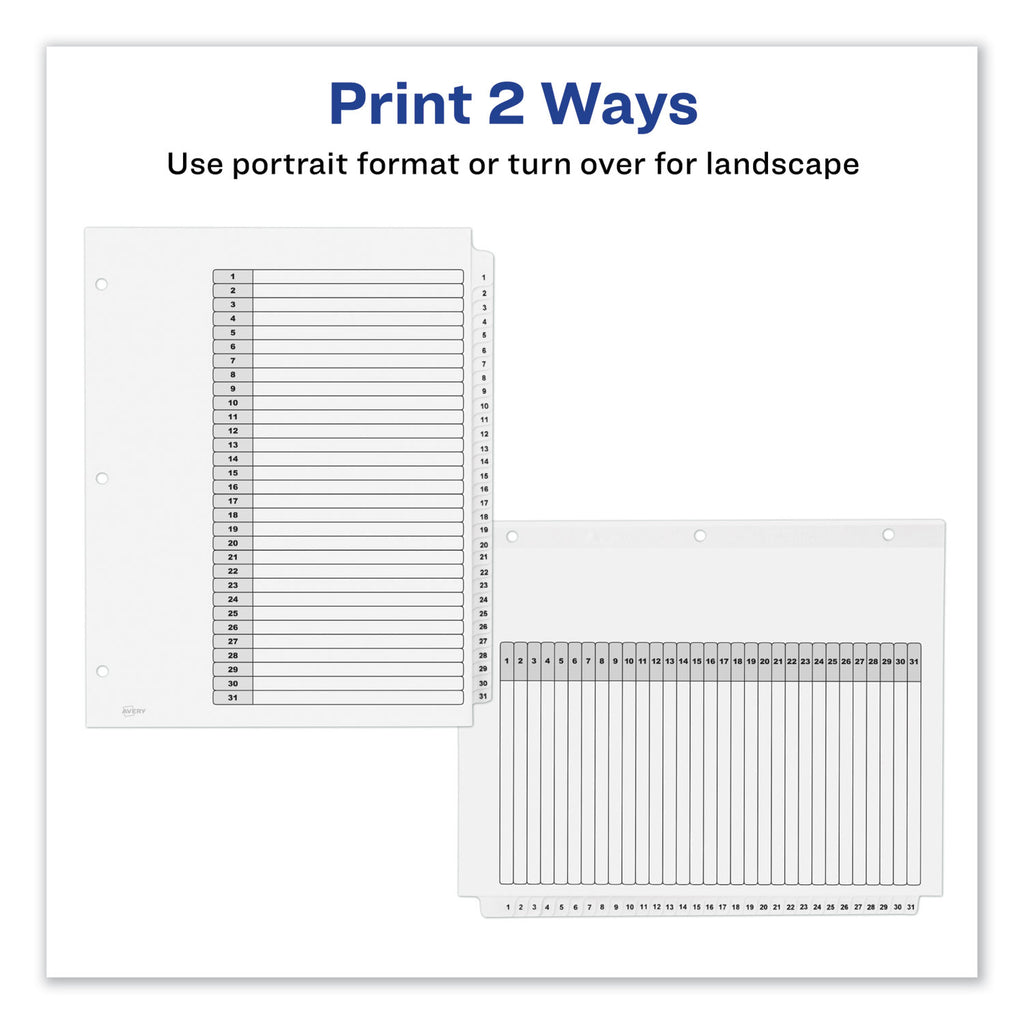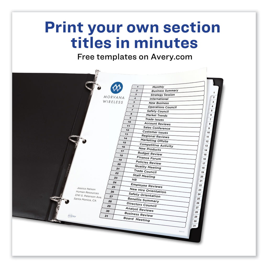 Sometimes finding information at a moment's notice seems like finding a needle in a haystack. These Ready Index® Table of Contents Dividers help you stay organized so you can locate important documents quickly and easily. They feature preprinted alphabetical or numerical tabs that are reinforced for durability and can be used in either landscape or portrait format. Using free templates from Avery Design & Print, you can customize the included title page and print in minutes. Organization and efficiency,— now that's sharp thinking.