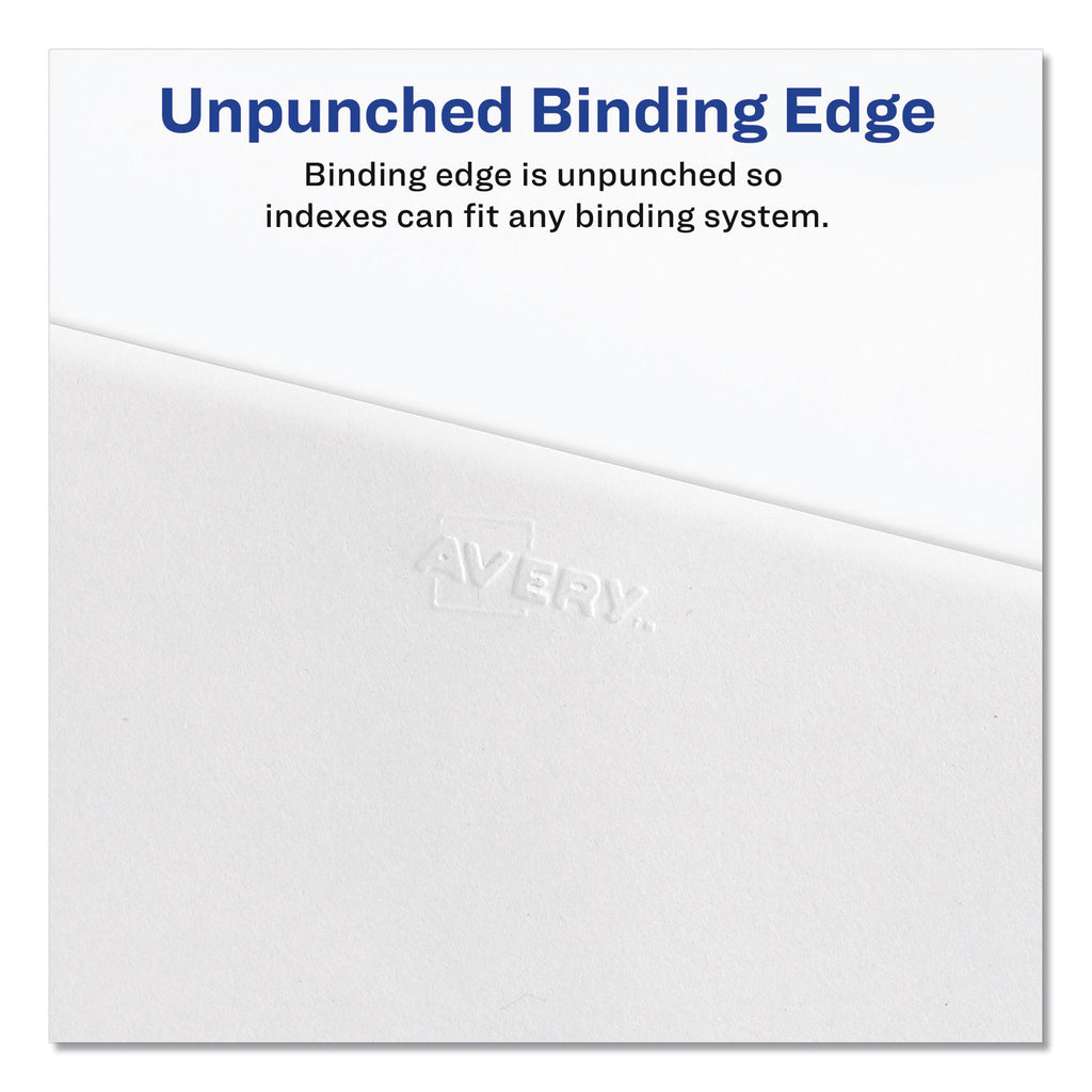 Rip Proof™ reinforced, dual-sided, laminated tabs make it easy to organize your information. The binding edge is unpunched, so these dividers can fit practically any binding system. Ideal for briefs, legal exhibits, mortgage documentation files and more! Avery® Style is Helvetica bold type style and Allstate® Style is Helvetica regular type style.