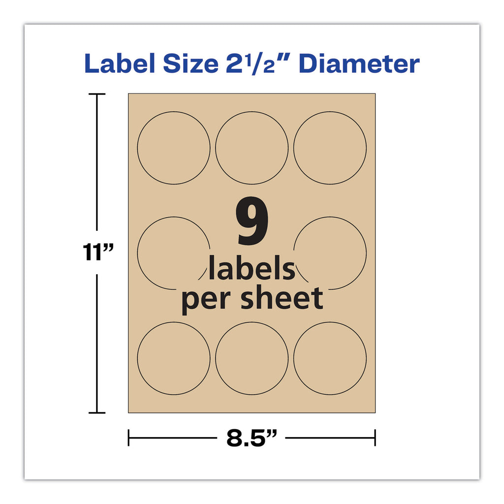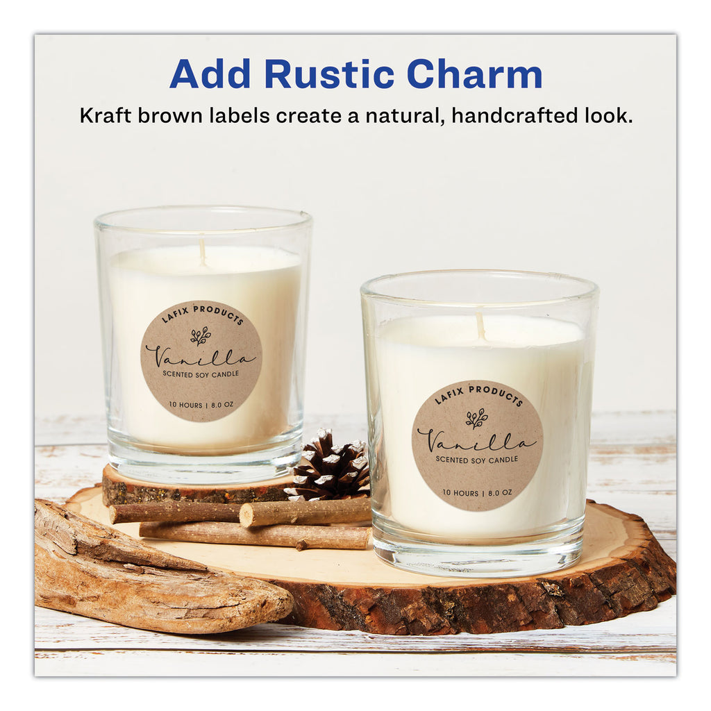 Kraft brown round labels are ideal for branding and promotional applications. Print-to-the-edge feature allows you to extend colors right to the edge of the label to get a customized look. Permanent adhesive tightly bonds to paper, cardboard, corrugated materials and more. In short, these labels are guaranteed to stick and stay. Easy to customize with free templates and designs using Avery Design & Print. Recyclable and made entirely of recycled materials. 8.5" x 11" sheets for laser and inkjet printers.