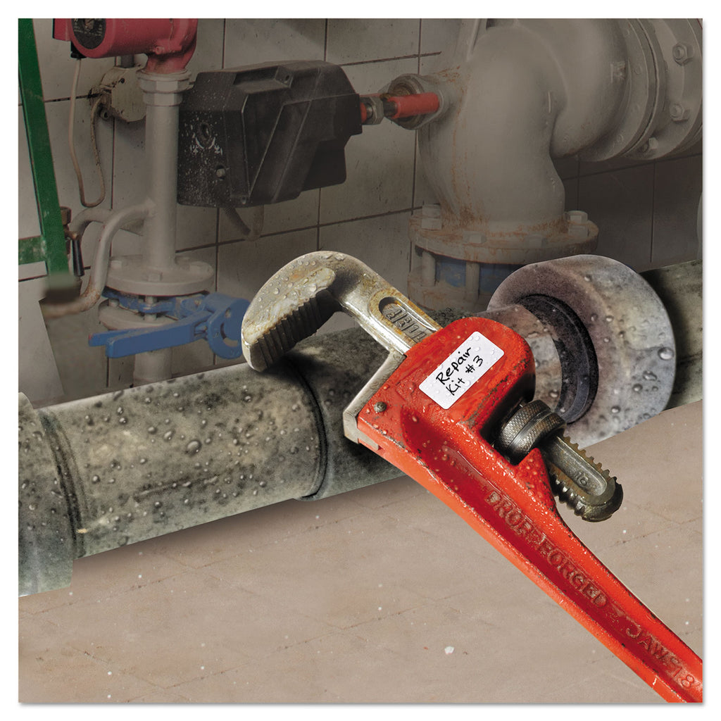 Extra-strong, ultra-permanent adhesive sticks securely to wood, metal, glass, rough plastic, cement and more. Durable, scuff- and tear-resistant material withstands exposure to moisture and moderately strong cleaners, such as: ammonia, multipurpose cleaners, hand and surface sanitizers, bleach and soap. Great for quick labeling of tools, equipment, parts bins and various objects in nearly any environment: offices, warehouses, manufacturing facilities, maintenance shops, etc. Handwrite with permanent marker to ensure long-lasting identification (standard ink may wash off). Not for use with copiers or printers.