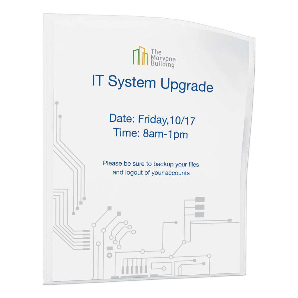 Keep your signs looking clean and sharp for as long as they're posted with these Removable Display Protectors. Durable material ensures that your signs and other posted information look as good as new even after they've been hanging around for a while. Each display protector features two strips of removable adhesive that allow you to affix your display firmly and remove it easily without damaging the surface. The acid-free and archival-safe material won't lift print from your papers for a view that stays diamond clear. With these self-adhesive sheet protectors, all signs point to success.
