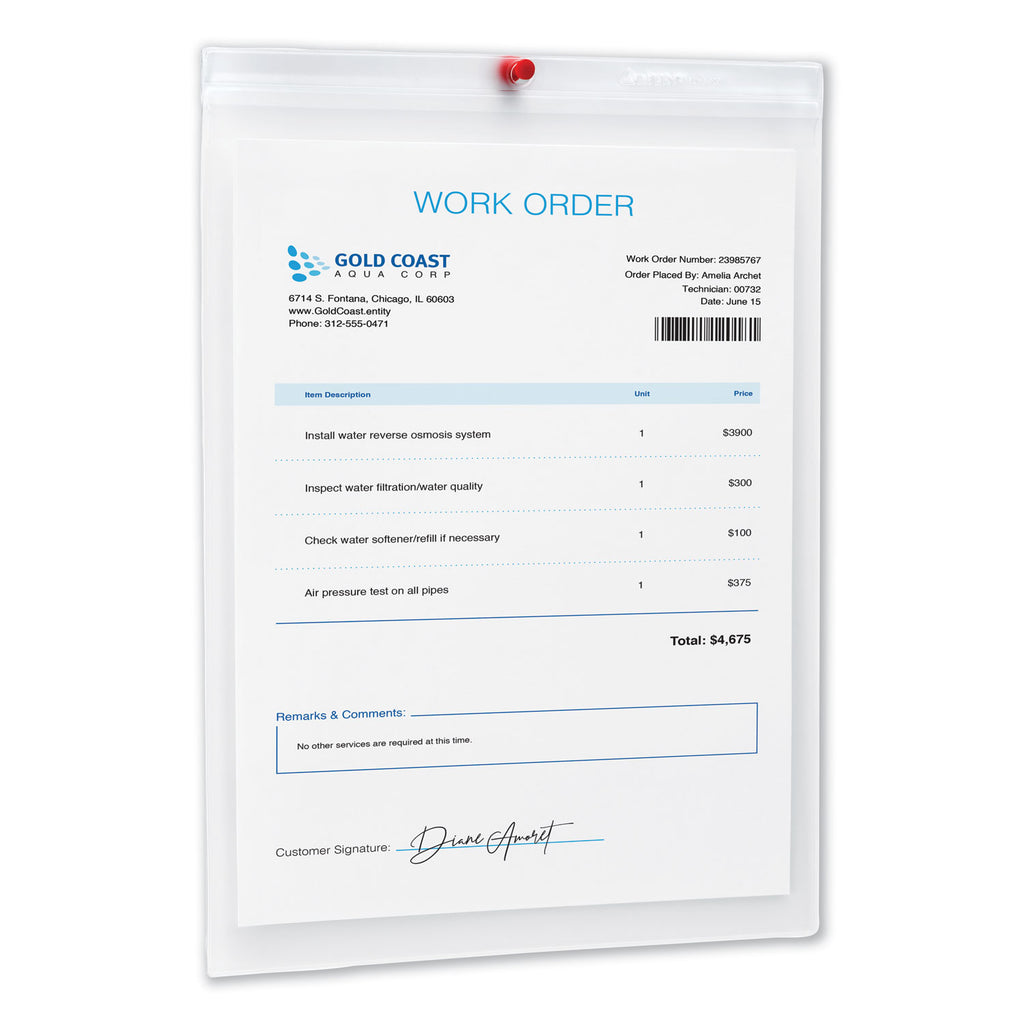 Your job tickets let you keep track of your progress on a task. Use Job Ticket Holders to ensure that this important information stays close at hand and free from damage. Other documents related to the tasks can be kept with the job ticket in one convenient place. The heavy-duty vinyl material provides protection against tears, spills and other damage as your firm makes progress on the assignment. A convenient hole at the top facilitates hanging, so you can avoid misplacement and keep the job ticket at eye level for quick reference. With these Job Ticket Holders, you've got just the ticket for workday success.