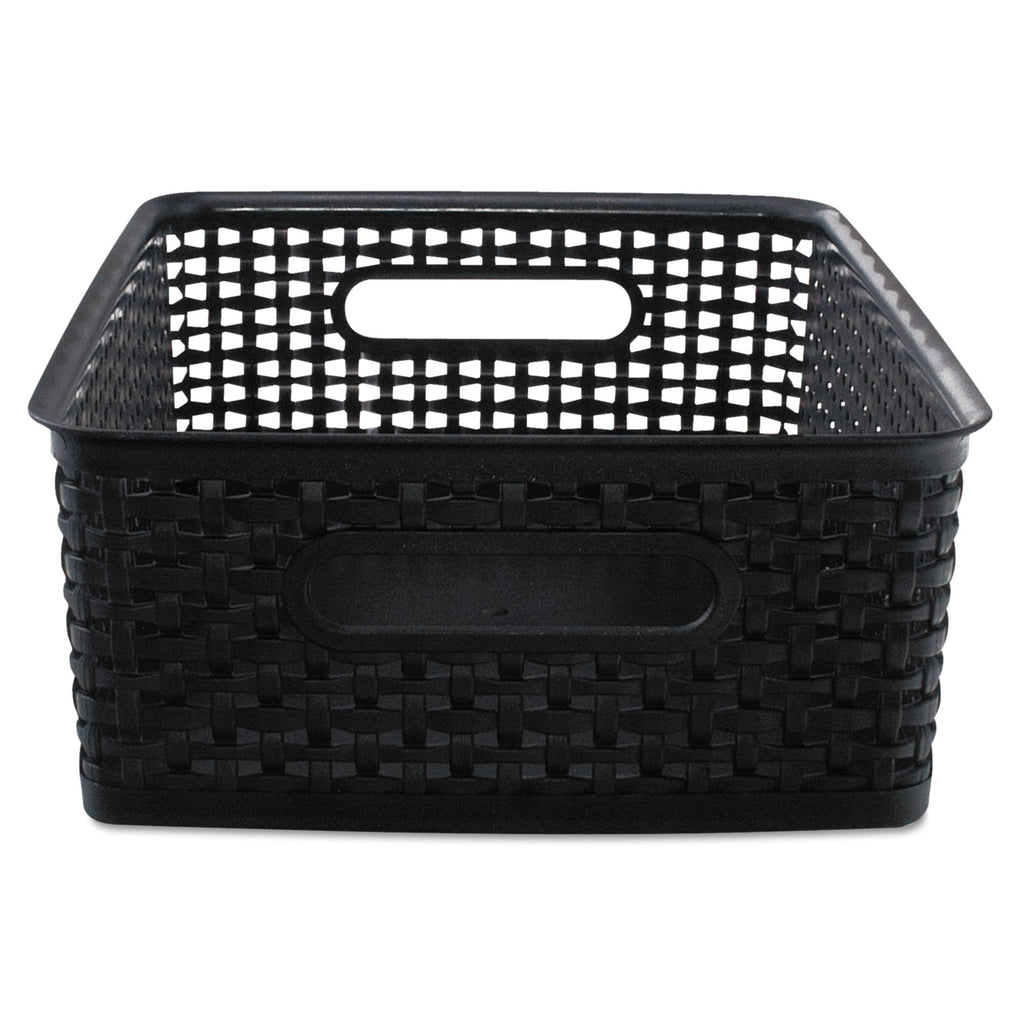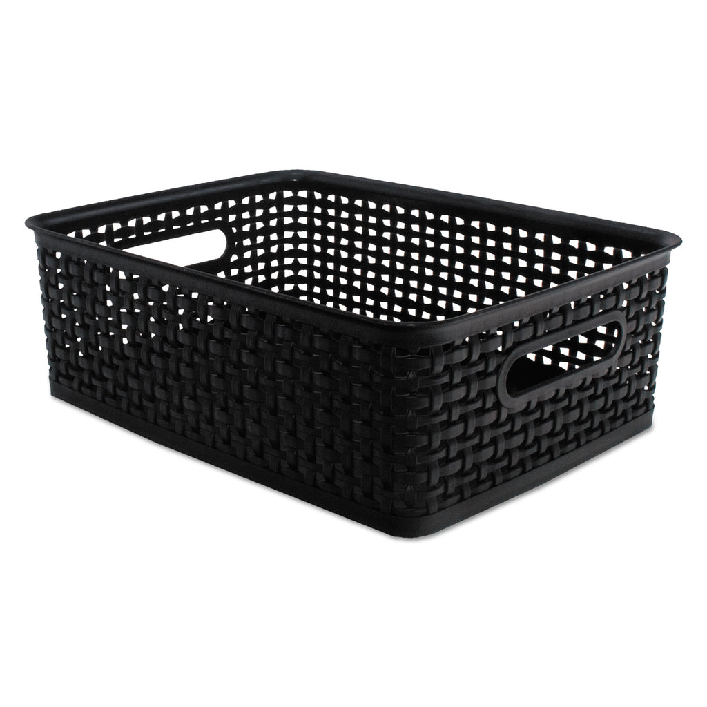 Attractive black baskets with woven design will get your workspace organized. Great for storing all sorts of items including CDs, DVDs, office supplies and more. Sturdy plastic construction. Comes in a multi-pack with one small, one medium, and one large.