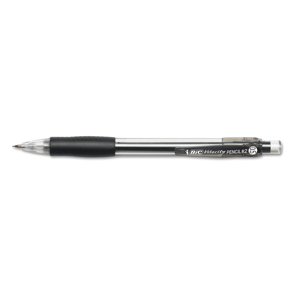 The BIC Velocity Original Mechanical Pencil offers smooth, dark writing that erases cleanly. This pencil comes with strong #2 lead that creates strikingly dark marks, perfect for standardized tests, and a soft grip that provides writing comfort and control. Outfitted with a durable eraser, these versatile pencils help you keep your tests, notes, and compositions tidy. Each pencil comes preloaded with three strong #2 leads and is refillable.