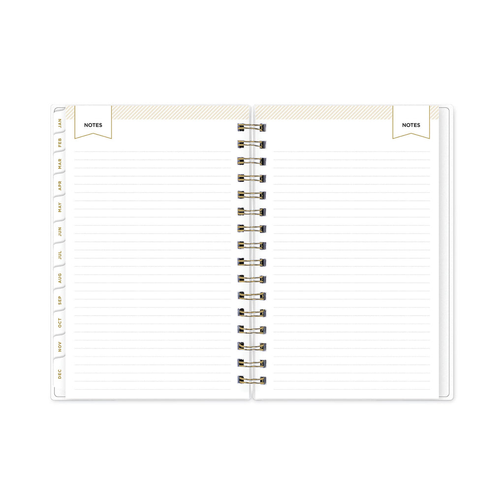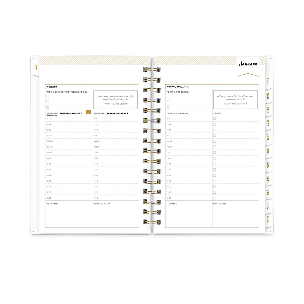 Design your life with Day Designer, the simple and easy system created to help users find balance and productivity. Includes introductory letter from Whitney English, worksheets for personal goals and intentions, dated calendars, yearly overviews, holidays and notes. Daily calendar view per page contains Today's Schedule in 30 minute increments from 6 am to 8 pm, To-Do list, Today's Top Three, Notes, Gratitude section, and an inspirational quote. Monthly calendar view per two-page spread offers a visual overview of your time plus a Notes and To-Do column. A flexible frosted cover adorns the outside while twin-wire binding and durable, coated tabs offer easy page turning and access to past, present and future months. Includes six bonus monthly views (July - Dec).