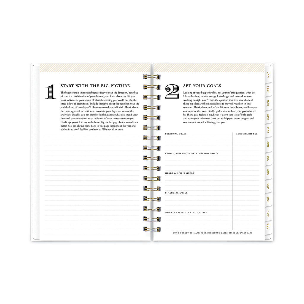 | Separate Sections | (6) Bonus Past Monthly Spreads (July-Dec), Four-Step Planning System, Holidays, Notes/Memos, Two-Year Reference Calendar |