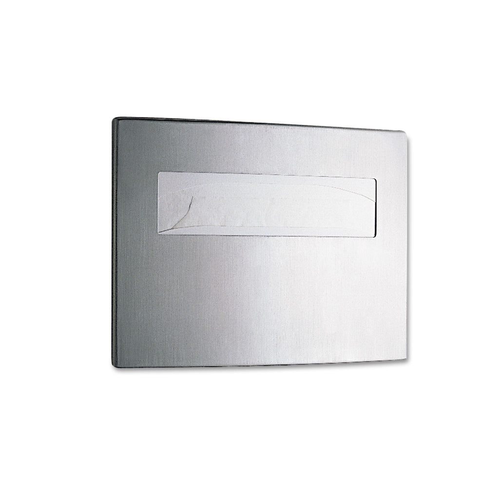 Satin finish resists fingerprints. One-piece, seamless construction. Holds 250 single- or half-fold covers. Dispenser fills from bottom through concealed opening. Mounts with two screws (not included).