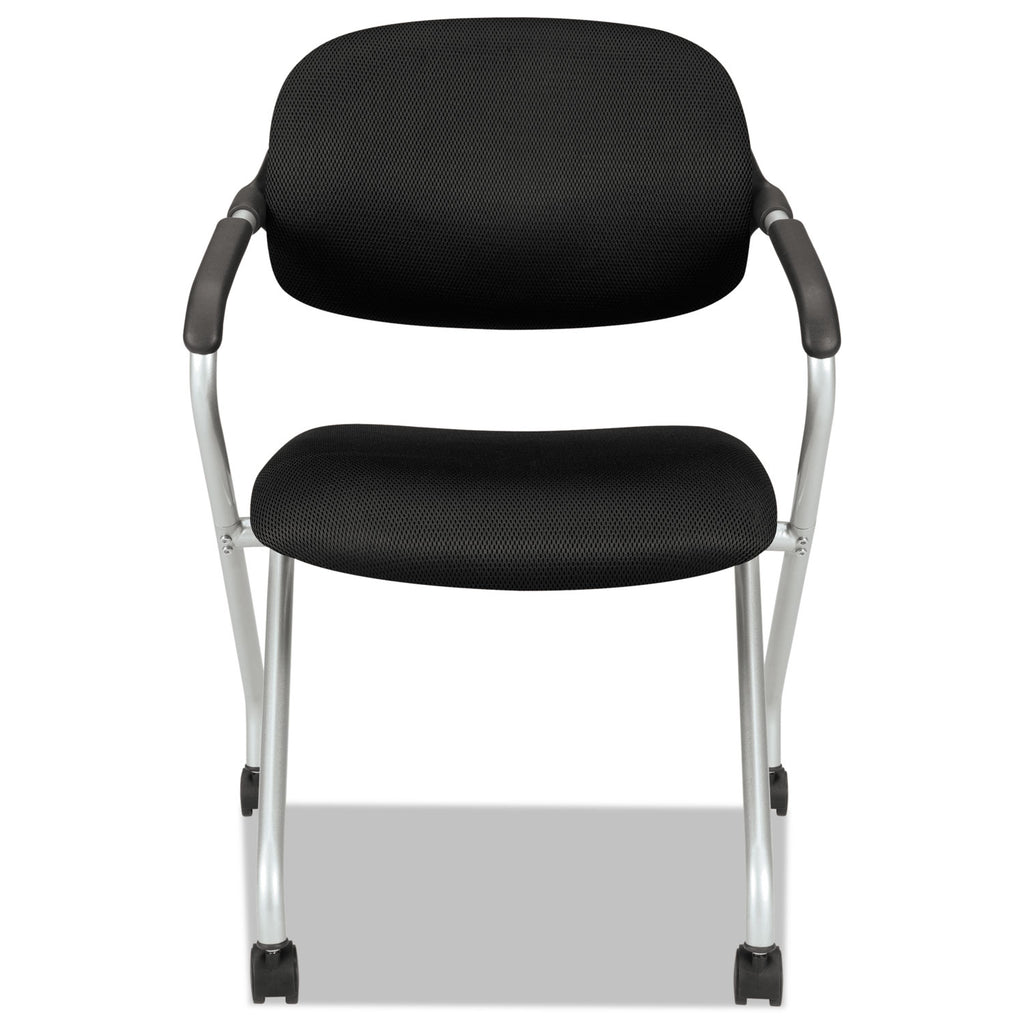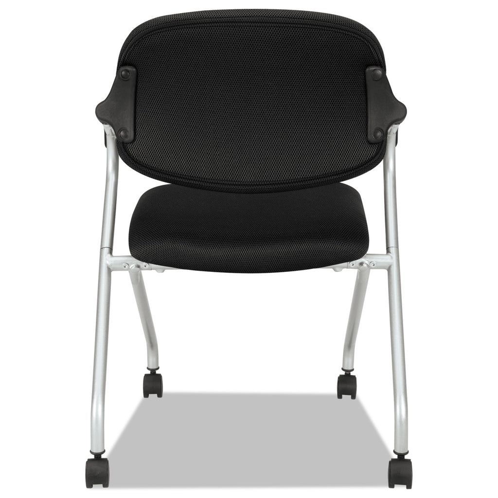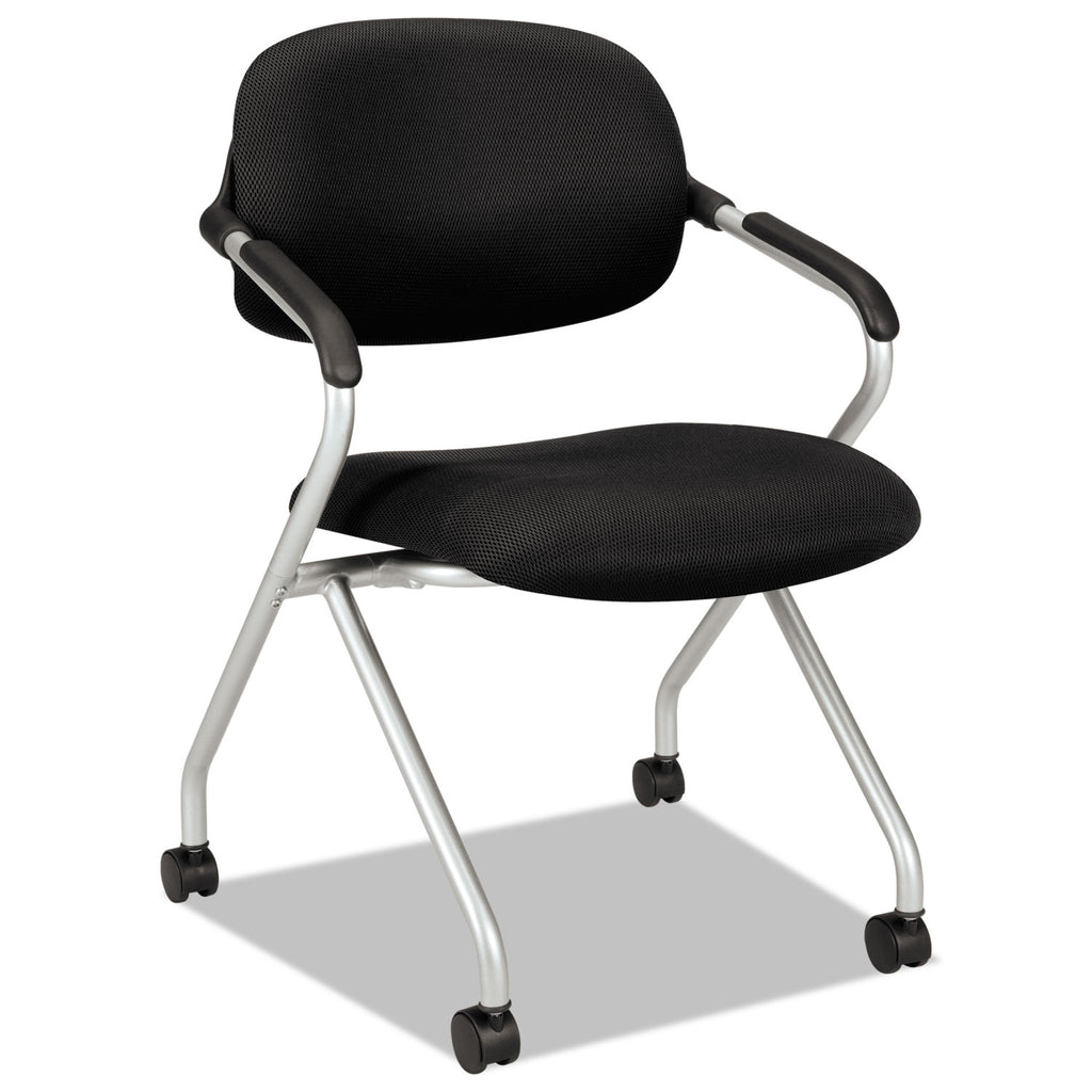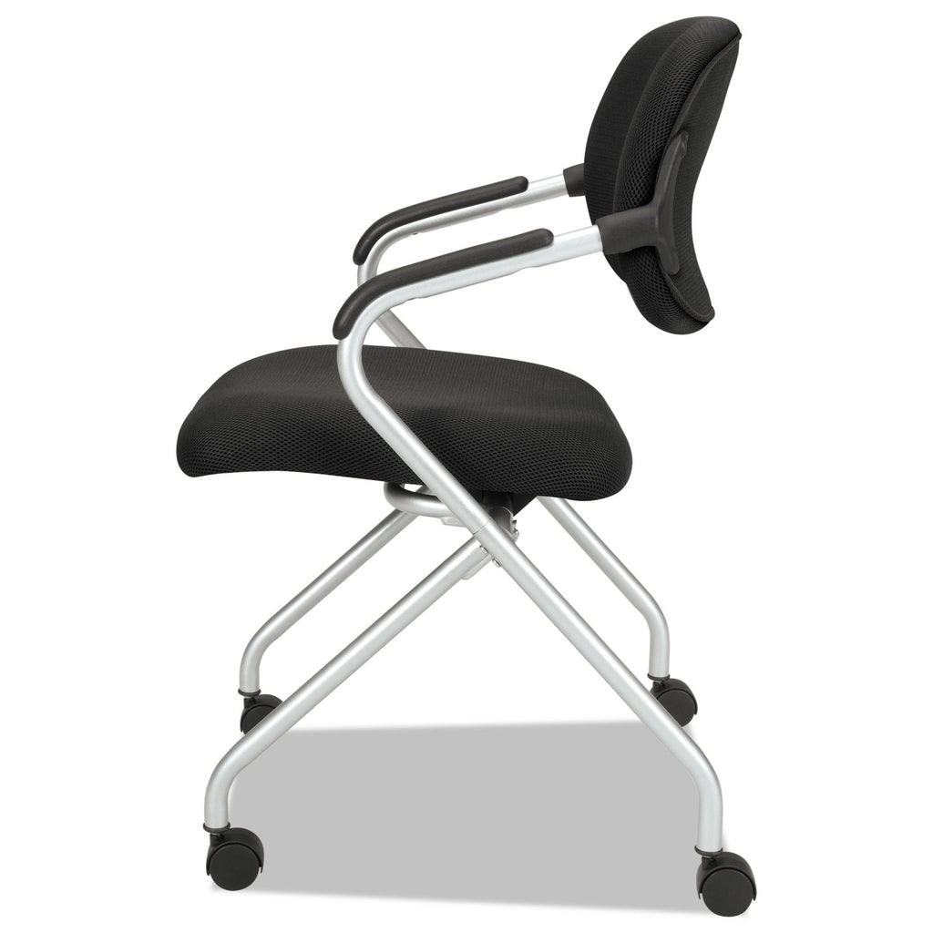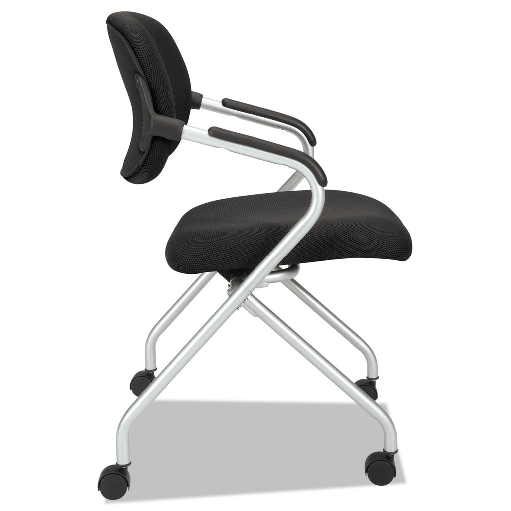 Contemporary design with a contoured upholstered back and flip-up seat. Folds to 8" for space-efficient nested storage. Padded arm supports for added comfort and easy-rolling casters for mobility.
