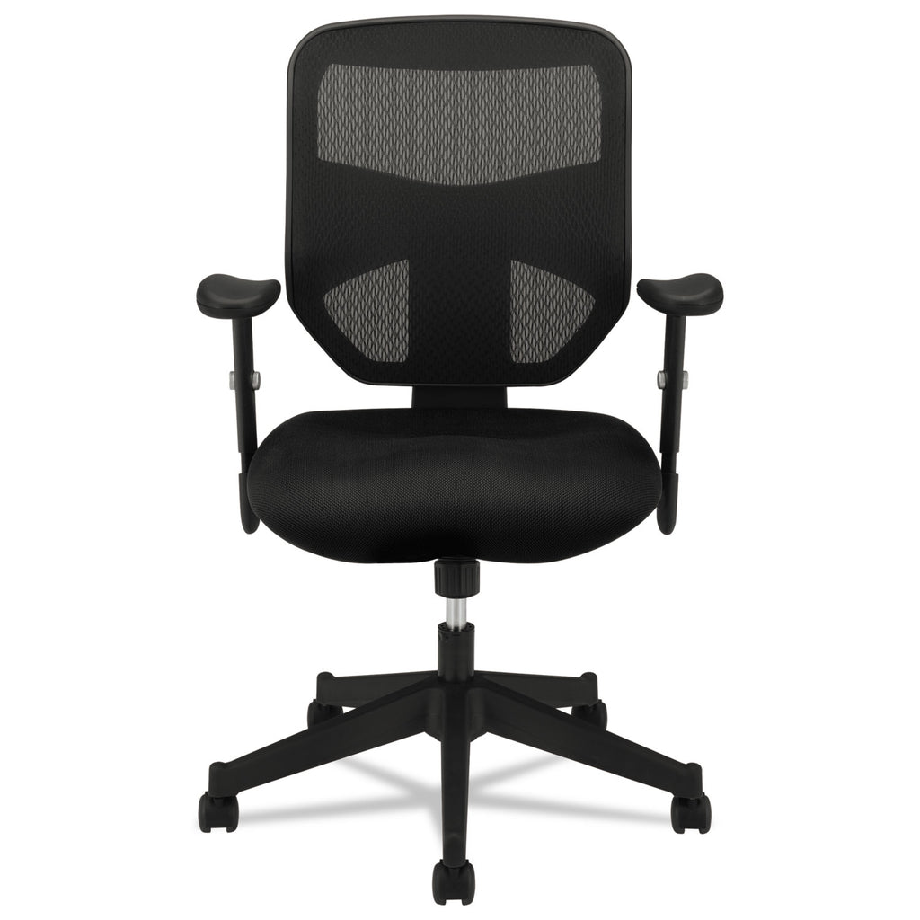 Form and function combined. Dramatic mesh back design offers cool, breathable support. Seat cushion has two layers of padding for increased comfort. Padded arms are height-adjustable for a custom fit. Five-star base with casters for easy mobility.