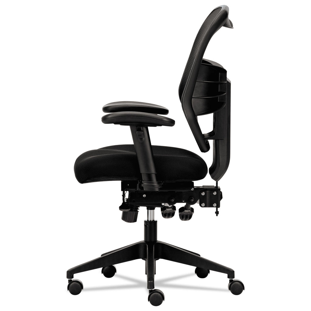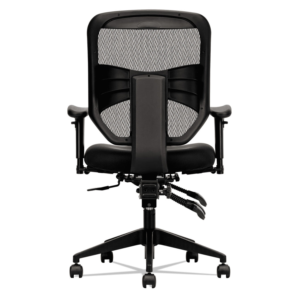 - High-back chair with breathable woven mesh back conforms to the upper body for added support.