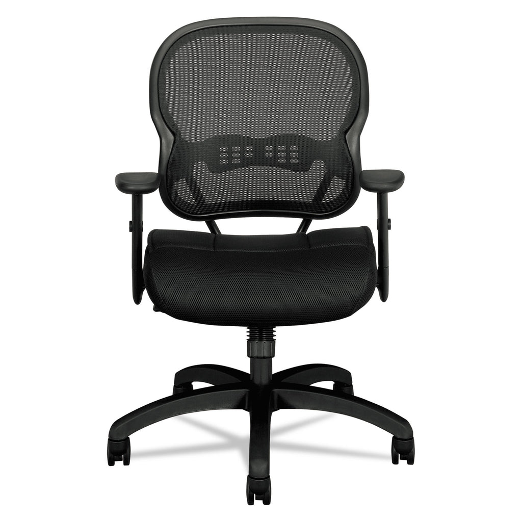 2-to-1 synchro tilt provides a deep, comfortable recline. Highly-styled breathable mesh back. Mesh seat cushion with two layers of padding for increased comfort. Height-adjustable arms accommodate a variety of users. Five-star base with casters for easy mobility.