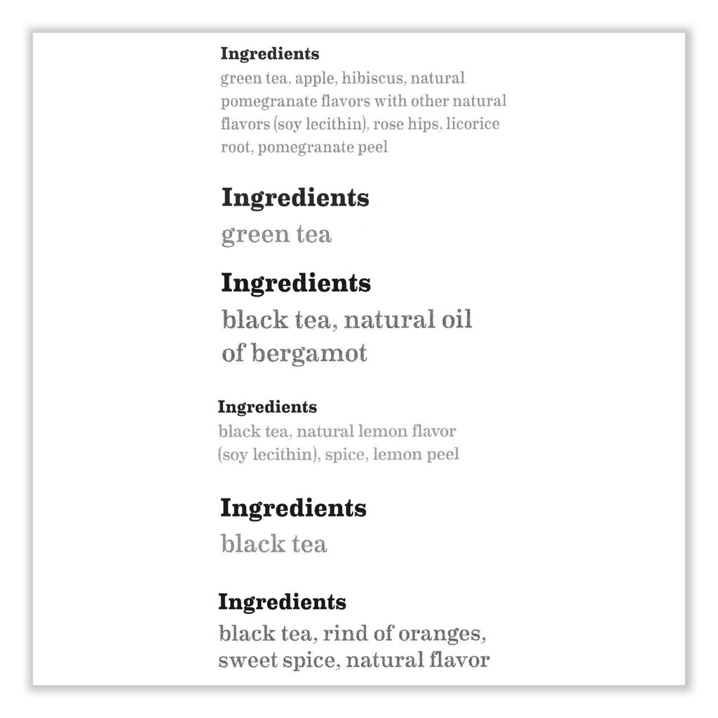 | Assortment | Cozy Chamomile, Earl Grey, English Teatime, Green Tea, Green Tea with Lemon, Lemon Ginger |