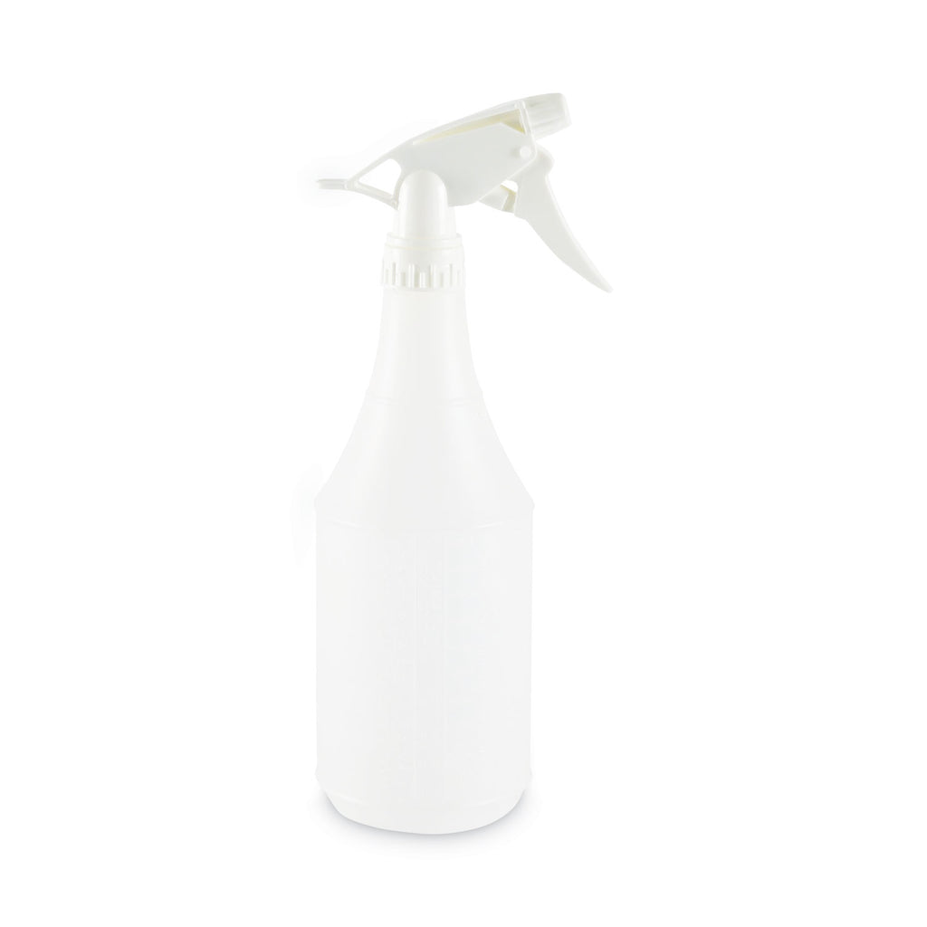 Clear bottle with embossed scale encourages user to properly proportion chemicals from larger containers and when mixed with water. Sleek, tapered neck bottle provides a more comfortable grip when used with a trigger sprayer. Easy-to-use, multi-purpose bottle for general-purpose cleaning in kitchens, bathrooms, offices, schools, and industrial settings. Securely holds cleaning solvents and water without spilling. Trigger sprayers sold separately.