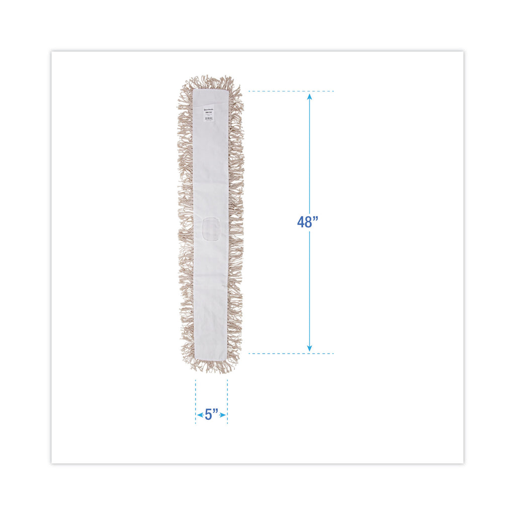 Ten-ply, Hygrade white cotton, cut-end design enhances durability while minimizing snags. Quick-drying, absorbent, slot pocket style with synthetic backing. Used for attaching a mop handle and dusting floors. Works with spray or liquid dust mop treatment and other solutions used to dust floors and add shine. Great for general purpose cleaning and wiping floor surfaces of various materials. Mop handle and dust mop frame are sold separately.
