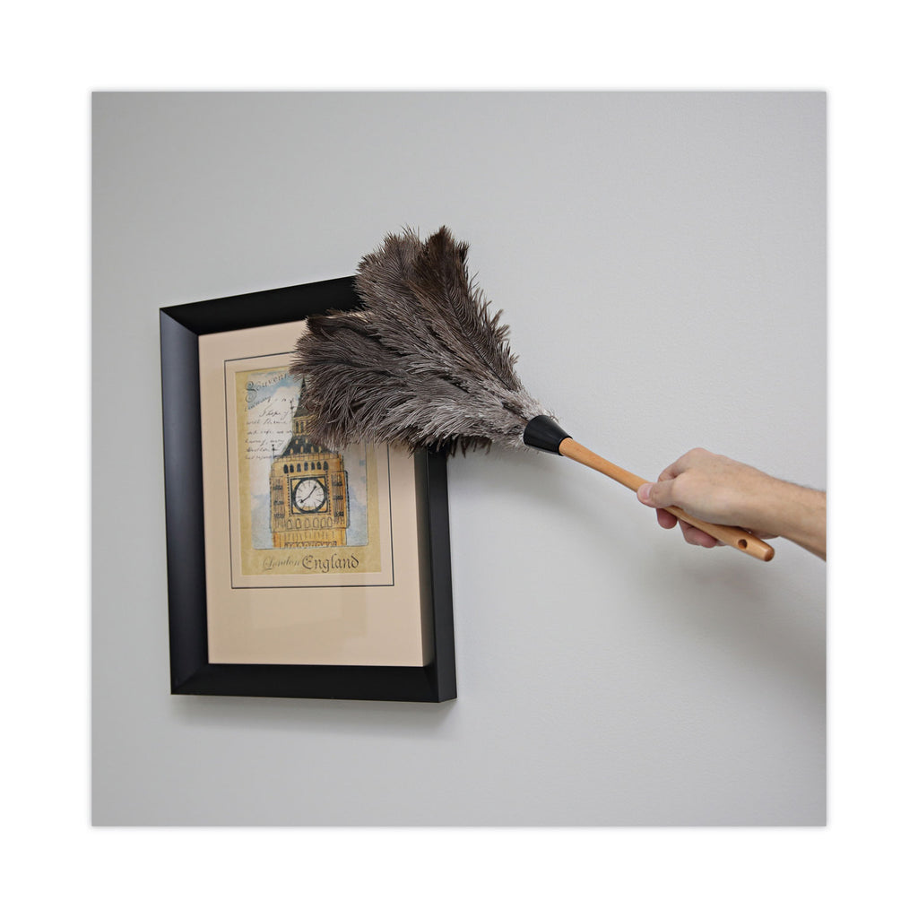 Professional quality, Ostrich feather duster. The real feathers attract and hold dust until shaken. Stained, contoured wood handle for maximum durability and comfort. Smooth finish handle resists dust and includes a hang-up or lanyard hole for convenient storage. Comfortable and lightweight design for prolonged use. Great for dusting on a variety of surfaces without harsh chemicals or causing scratches to the surface. Flexible design is easily maneuvered around objects.