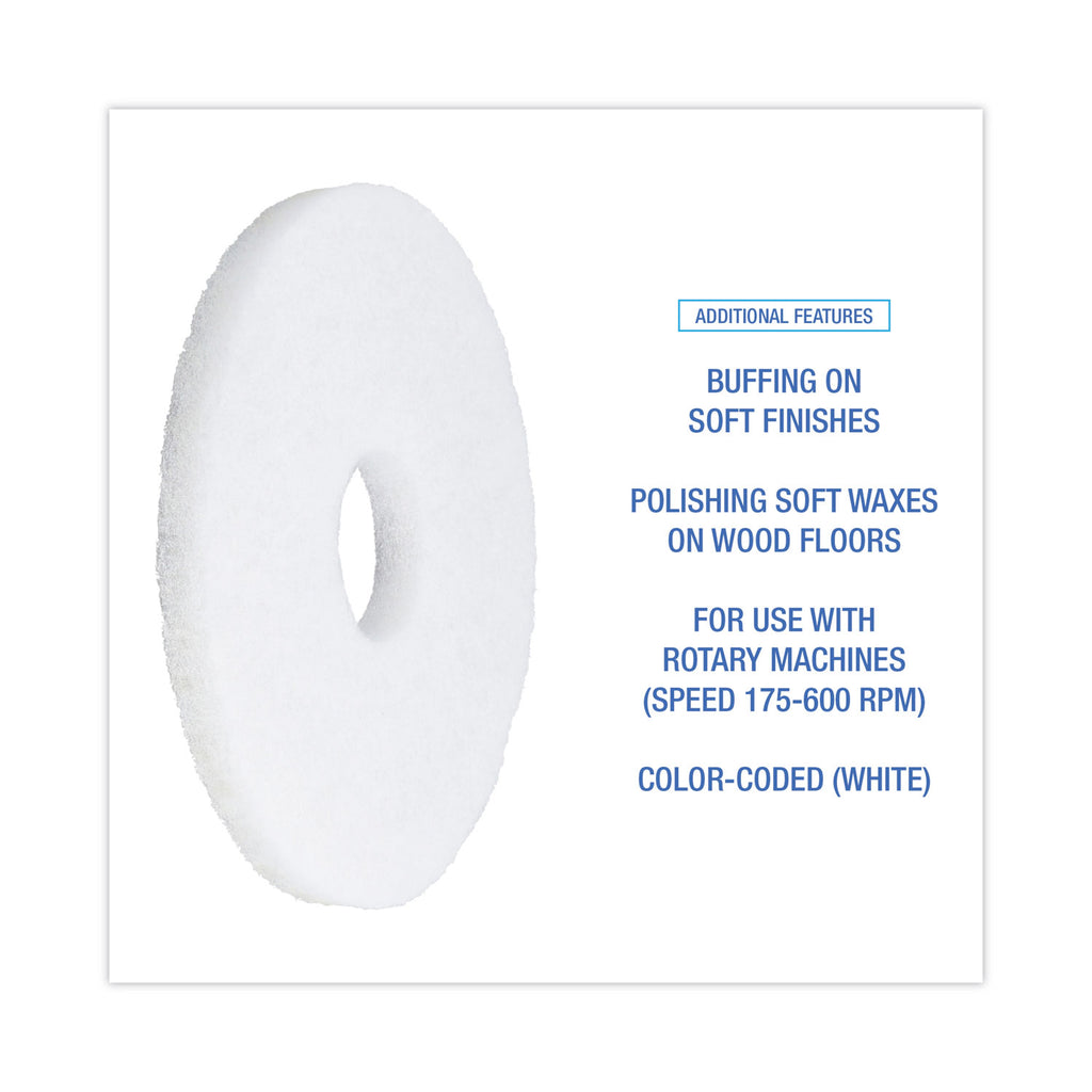 Take your soft finish floors to the next level with a polishing floor pad that attaches to a rotary machine. Create a smooth and protective finish by using the floor pad to polish and apply protective treatment. Value product that’s ideal for buffing very soft finishes or polishing soft waxes on wood floors. Color-coded for easy job identification. For use with a rotary machine (Speed of 175 to 600 RPM).