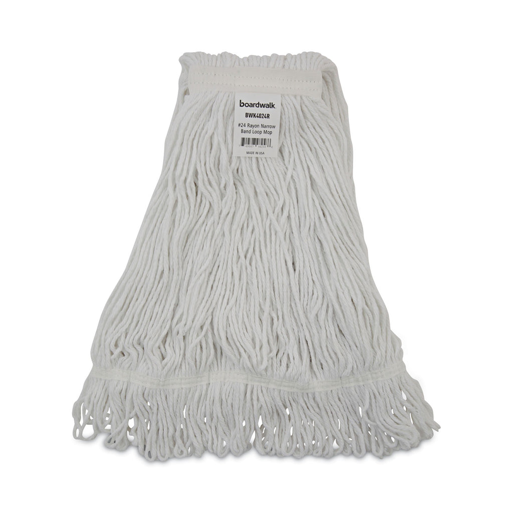 This sturdy mop head is made with premium four-ply yarn and a heavy-duty, polyester tape headband. Constructed with a looped-end design that minimizes less lint, fraying, and unraveling. Built to be durable, the double-sewn tailband prevents tangles and provides more floor coverage. Made from high-quality fiber. Great for general cleaning or floor finishing. For use with clamp style mop handles, which are sold separately.